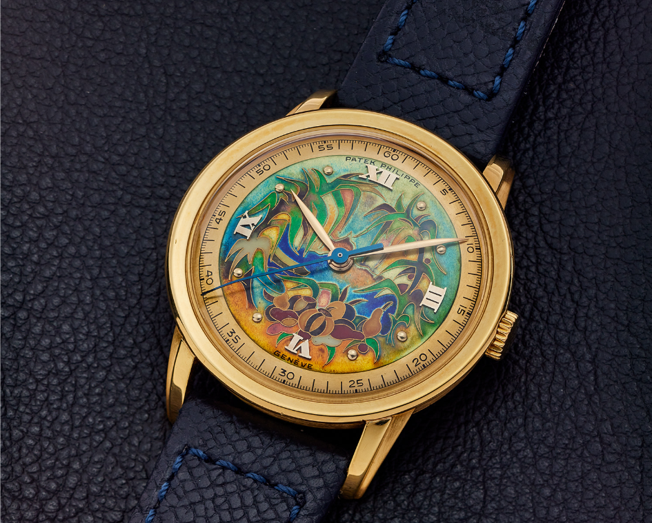 A Patek Philippe Ref. 2481 from circa 1952, featuring a cloisonné enamel “Pristine Forest” dial, was sold by Phillips New York in 2023 for USD 1,117,600, credit: Phillips Auctions