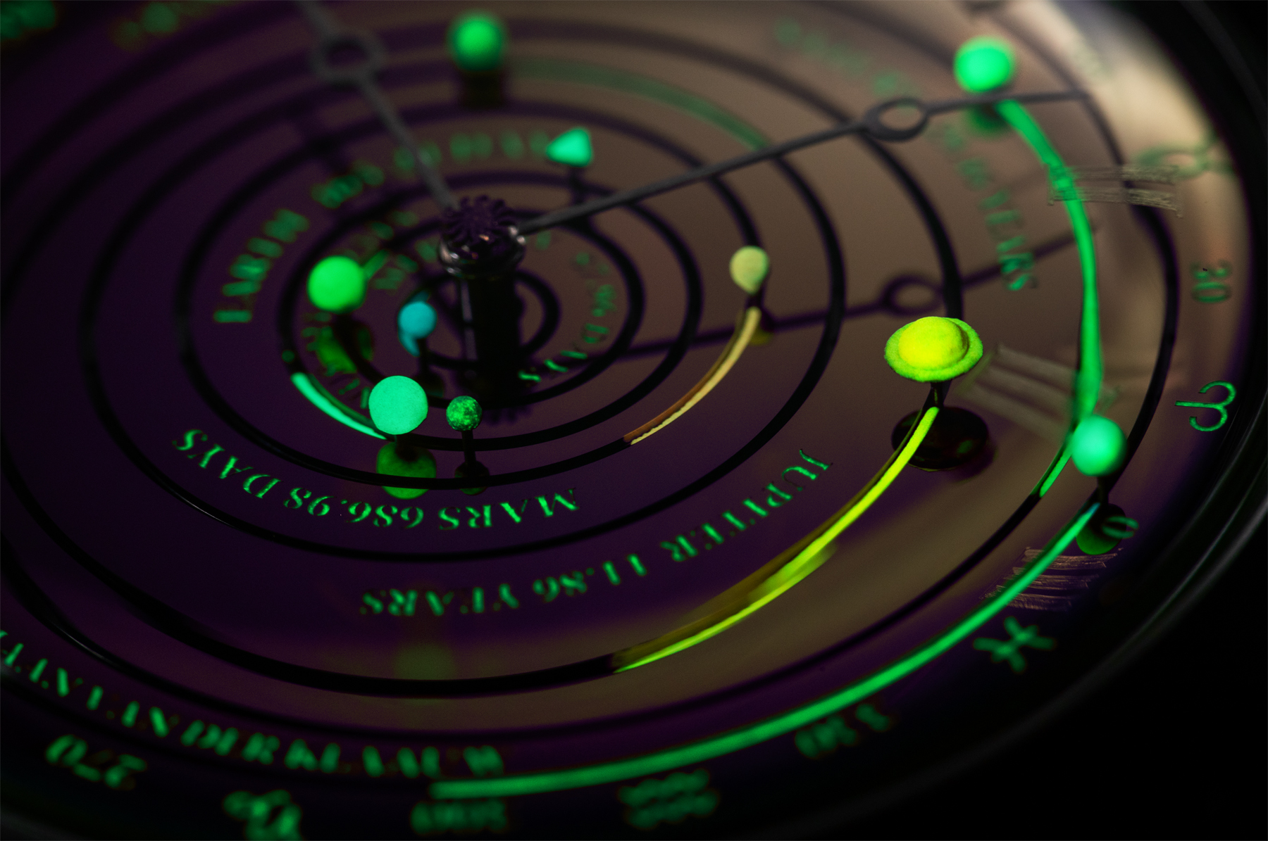 Notably, small engraved luminous markings indicate the orbital period of each planet: Mercury completes its orbit in 87.97 days, Venus in 224.70 days, Earth in 365.24 days and Mars in 686.98 days, while the outer planets move on a far more patient scale, with Jupiter taking 11.86 years, Saturn 29.46 years, Uranus 84.02 years and Neptune 164.80 years to circle the Sun.