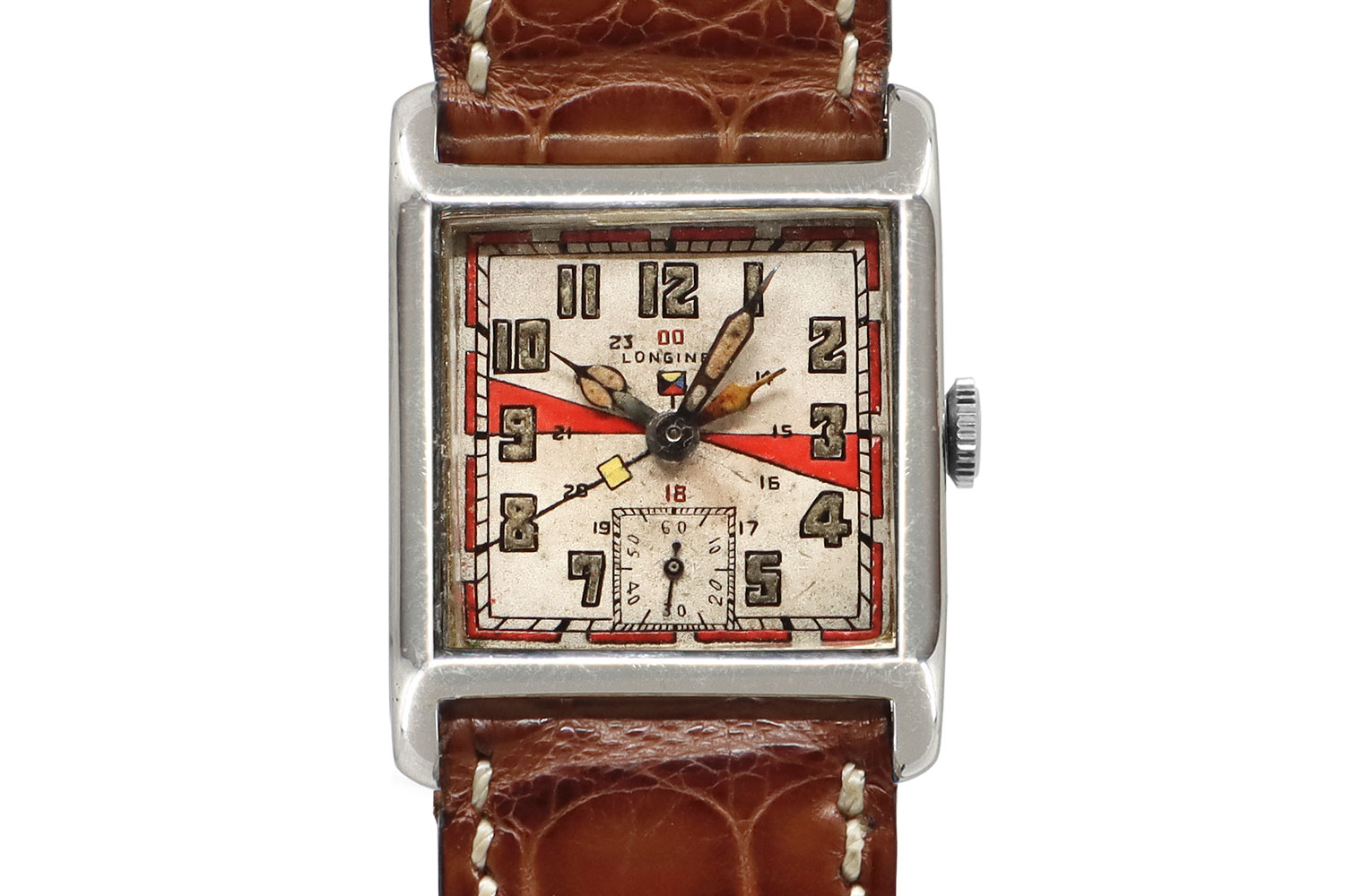 The Longines Zulu Time was the first to display local time and a second time zone simultaneously on a single dial. Its name, derived from “Zulu Time” (UTC +0, the aviation and military standard), is symbolized by a nautical “Z” flag beneath the 12 o’clock marker. Encased in a 34mm × 24mm square 18K white gold case, the watch is powered by the hand-wound Longines calibre 10.68N