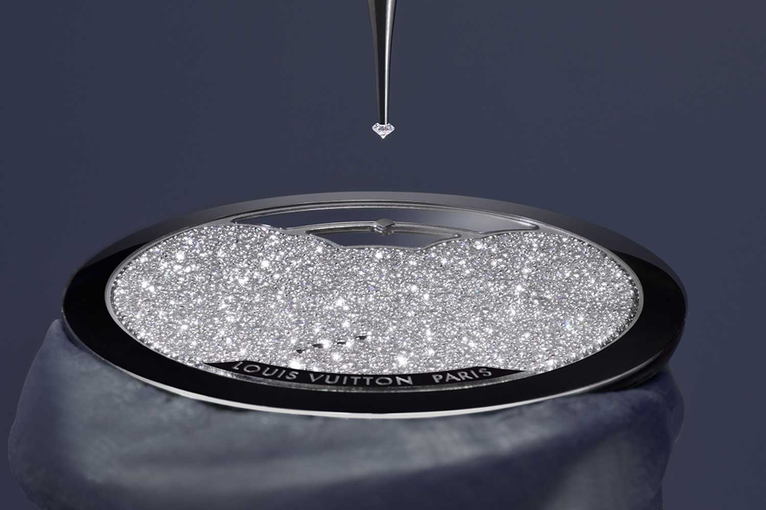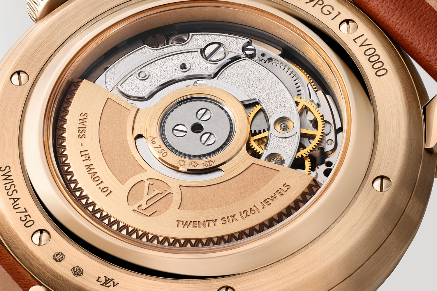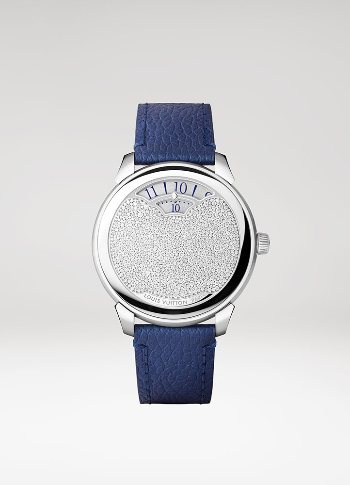 Two versions of the watch have been presented — rose gold and platinum, with the latter set with 795 diamonds. Produced entirely in-house by the newly integrated case-making facilities of Louis Vuitton in Geneva, the case is classically sized, measuring 37mm in diameter and 8mm in high. It retains the basic shape of the original with a slight taper from the bezel to the case back with a wider base, allowing it to sit snug on the wrist.