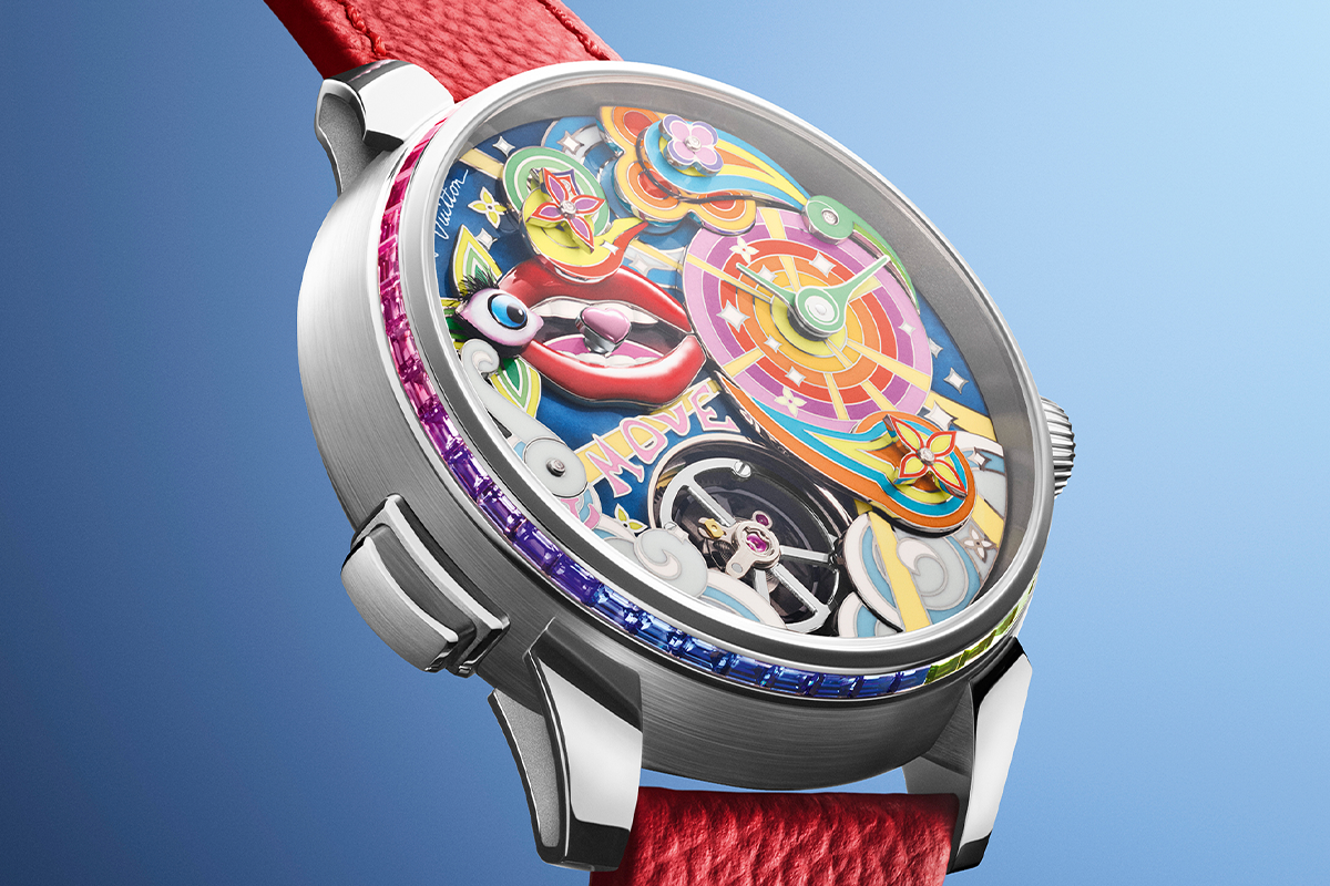 For this latest release, think Monogram flower power in a blast back to the Summer of Love with a strikingly colorful dial housed in a 42mm drum-shaped Tambour Taiko case in white gold. Seven animated elements, all rendered in brightly colored high gloss grand feu enamel, share the spotlight. A click of the pusher at 8 o’clock sets things in motion. Four Monogram flowers studded with diamond pistils swirl into action, while at 9 o’clock, the eye fringed with dramatic lashes made of real feathers gives you the once-over. A candy-pink sweetheart held between luscious lips rocks from side to side, as the letter “L” right below it swivels to reveal the letter “M” below it, exhorting “Love” to “Move.”