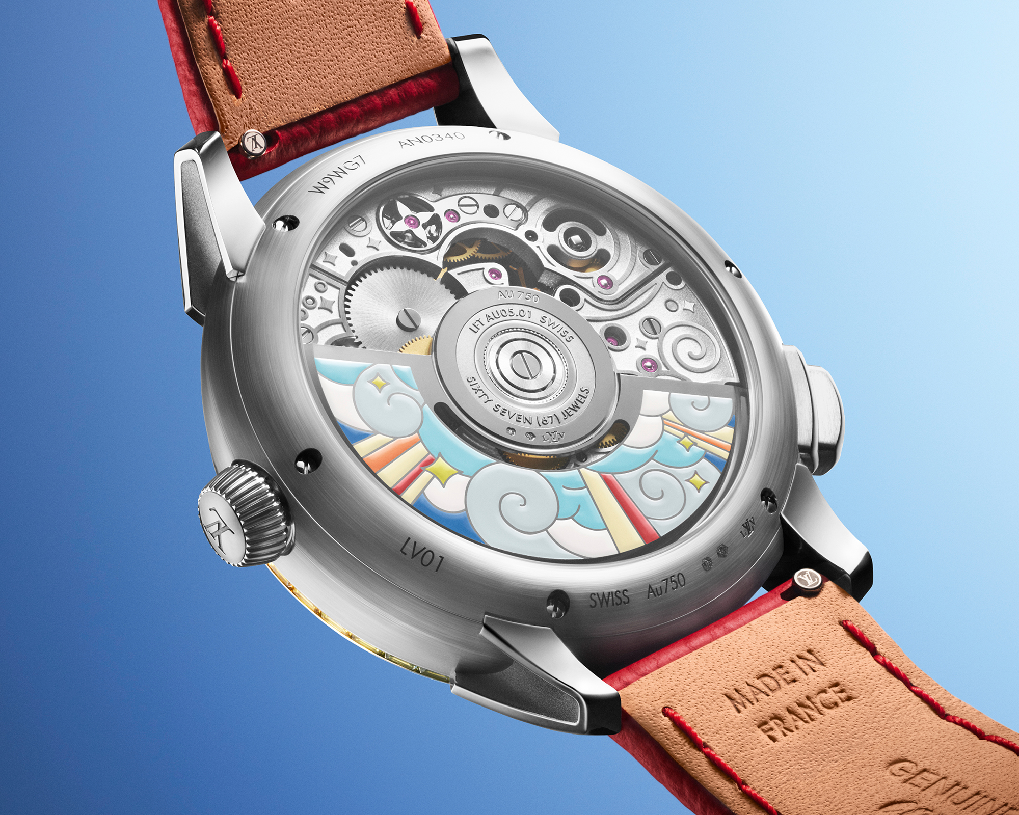 The exuberance continues on the back of the watch, where a sapphire caseback shows off the automatic in-house Caliber LFT AU05.01 developed and manufactured by La Fabrique du Temps Louis Vuitton. Its 18K white gold rotor is decorated by hand with a lively swirl of clouds, skies, sun and stars. The bridges, too, are carefully decorated with matching graphic motifs. A rainbow of 43 sapphires and five baguette-cut rubies runs along the bezel and frames the dial, adding sparkle and shine.