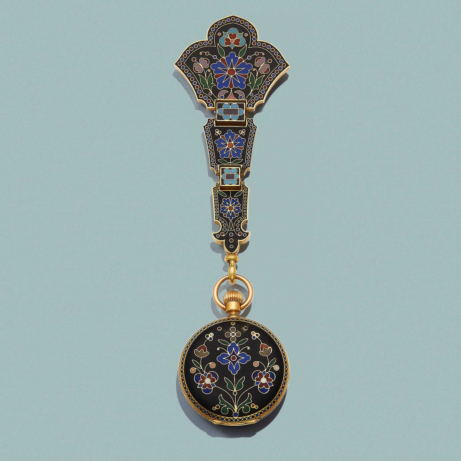 Pocket Watch, 1889: Gold, emeralds, pearls, crystal, enamel Exhibited at the Exposition Universe/le de 1889, Paris and the World's Columbian Exposition, 1893, Chicago, IL. The interior of the back case is inscribed, "C. O1 Neill / November 1893”, suggesting that it was purchased shortly after the 1893 fair