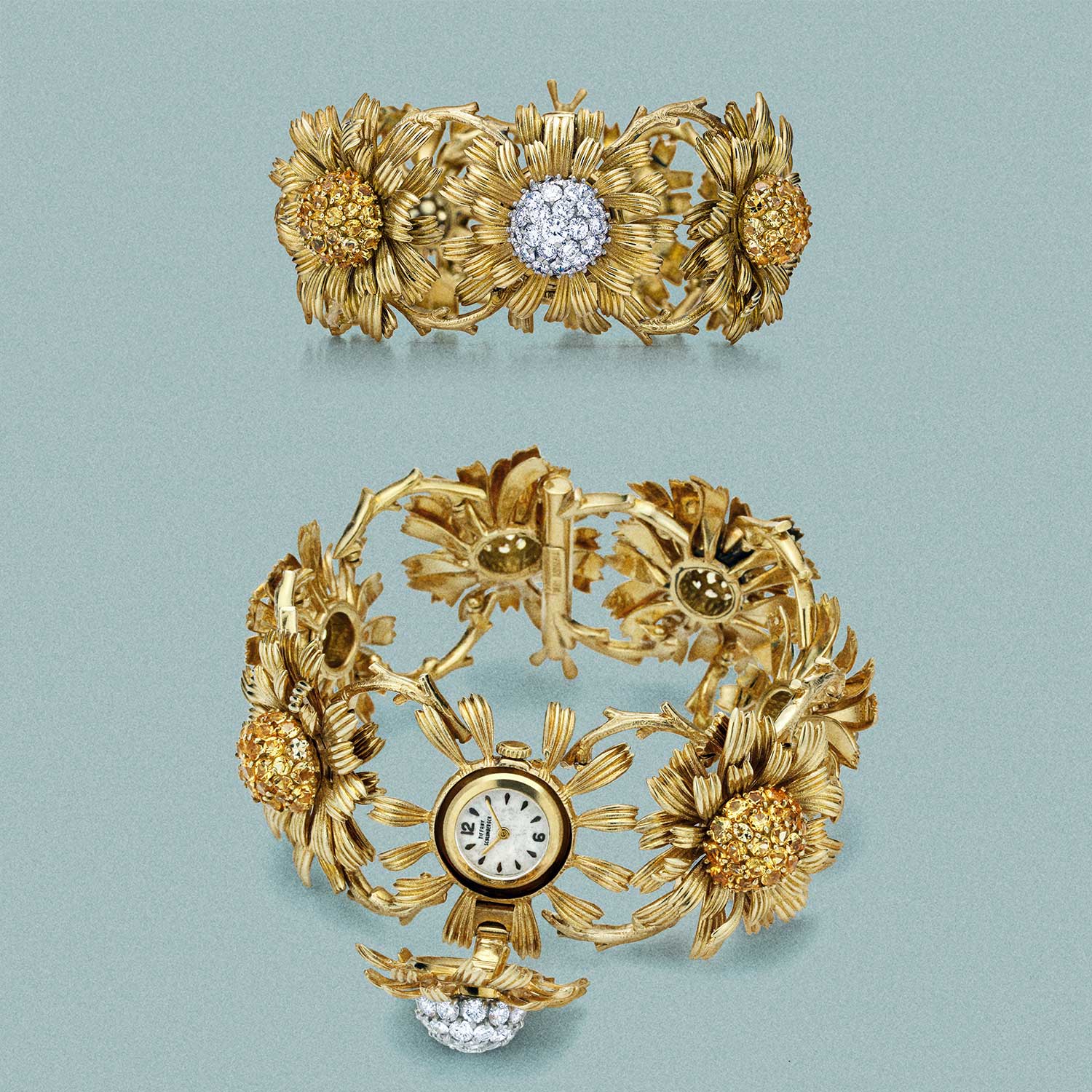 Dahlia Hidden Watch Bracelet, 1958: Gold, diamonds, yellow beryl, crystal, enamel A Jean Schlumberger for Tiffany & Co. design, this watch, housing a Movado movement, was purchased in December 1958 by American journalist, editor and publisher Katherine "Kay" Field, wife of Marshall Field IV, the owner of the Chicago Sun and heir to the Marshall Field's department store fortune