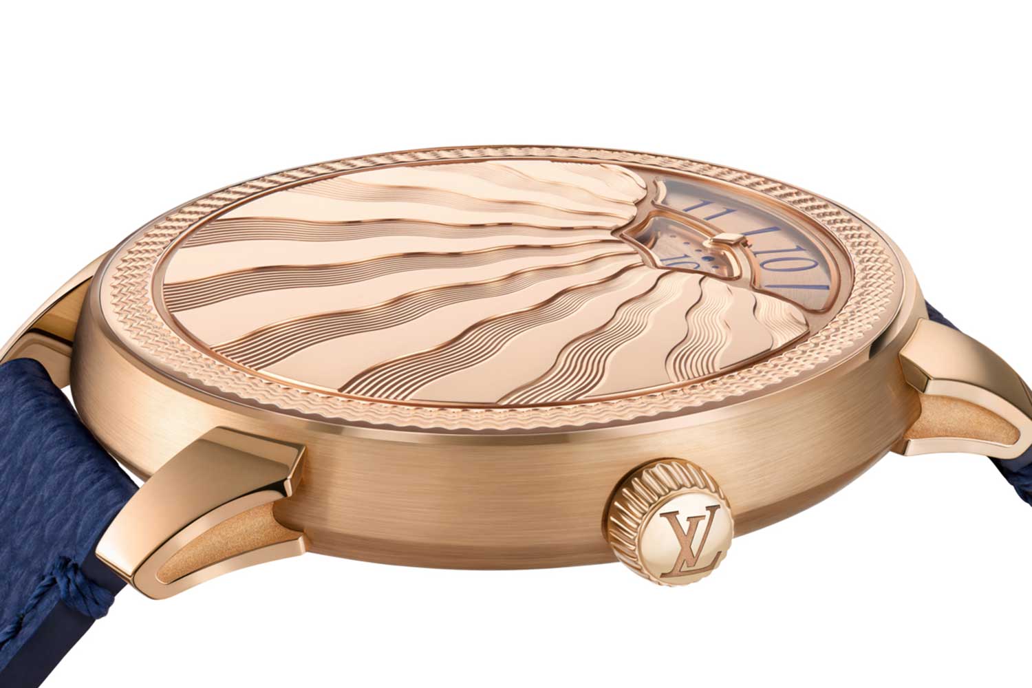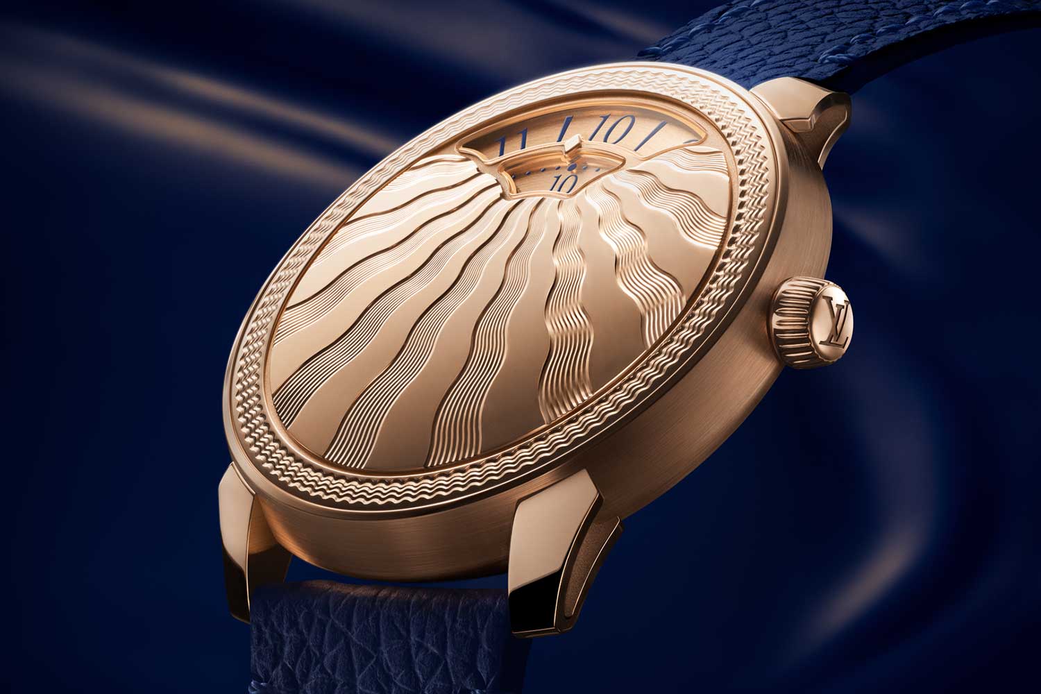 Two different patterns produced on two separate manual lathes are featured on the Tambour Convergence Guilloché. The first is made using a rose engine machine from 1850s, fitted with traditional rosettes for a delicate concentric wave around the perimeter. The second linear pattern, meanwhile, is made with a straight-line engine from 1935, adapted with a bespoke cam to ensure the smooth flow you see on the dial plate. To ensure contrast and overall tactile richness, the lines are etched deeper, up to three times more than conventional dial guillochage, according to Louis Vuitton. The entire process takes no less than 16 hours for a single dial, after which it will be polished by hand for the final shine.