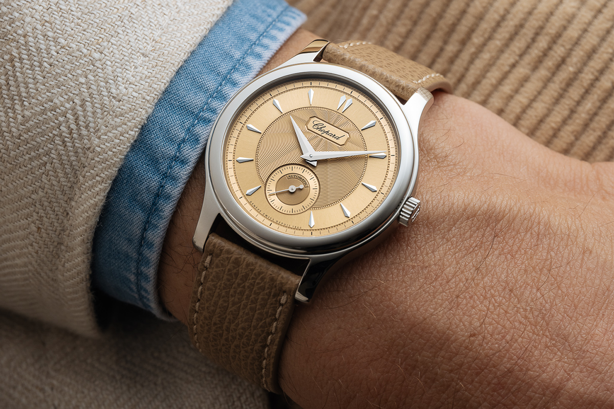 This special edition retains the same elegant proportions as the original 1997 model, with a 36.5mm “Lucent Steel” case and a time-only layout. Its 18-carat yellow gold dial showcases Chopard’s signature sunray guilloché, rendered in a sublime tone that sits between salmon and gold.
