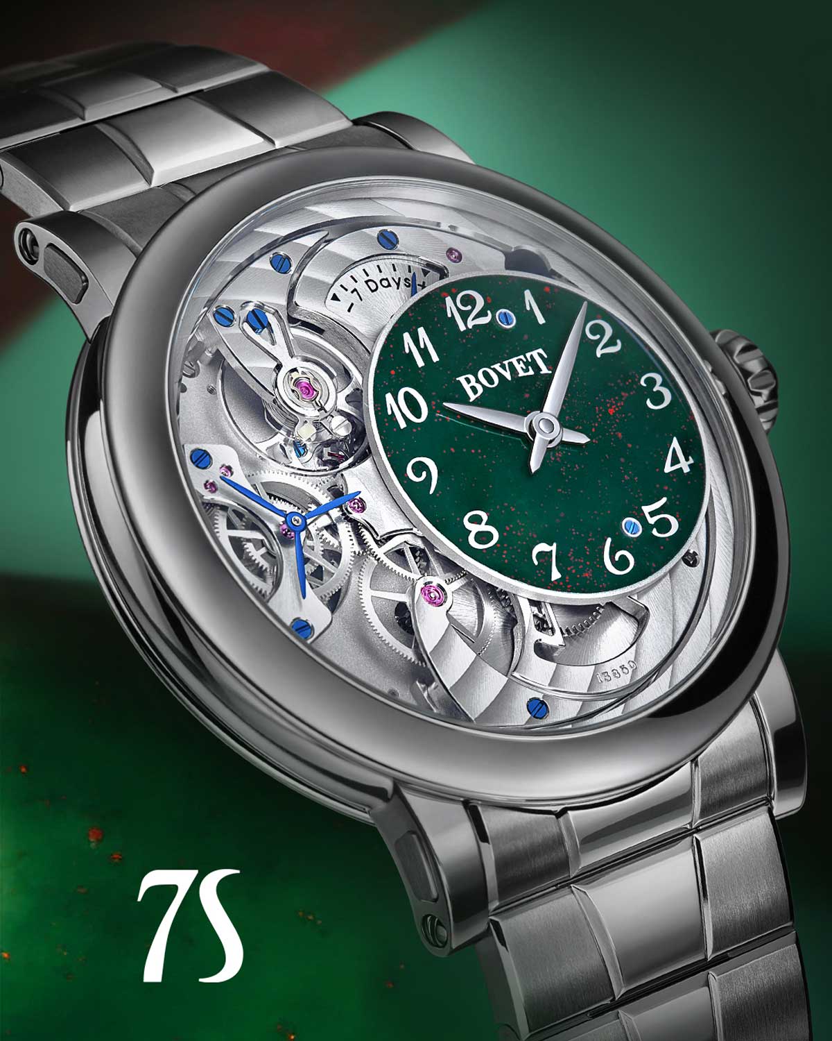 Encased in Grade 5 titanium and powered by a hand-wound movement with a seven-day power reserve, the timepiece represents both physical beauty and mechanical mastery. Pascal Raffy, owner of Bovet, calls the collaboration “a reflection of shared values of craftsmanship, artistry, and timeless elegance,” while Mohammed Abdulmagied Seddiqi describes it as “a symbol of partnership and excellence that continues to inspire.” The vivid green tones of the stone dial with their distinctive bood-red flecks render each piece utterly individual – a celebration of both time and nature’s unrepeatable design.