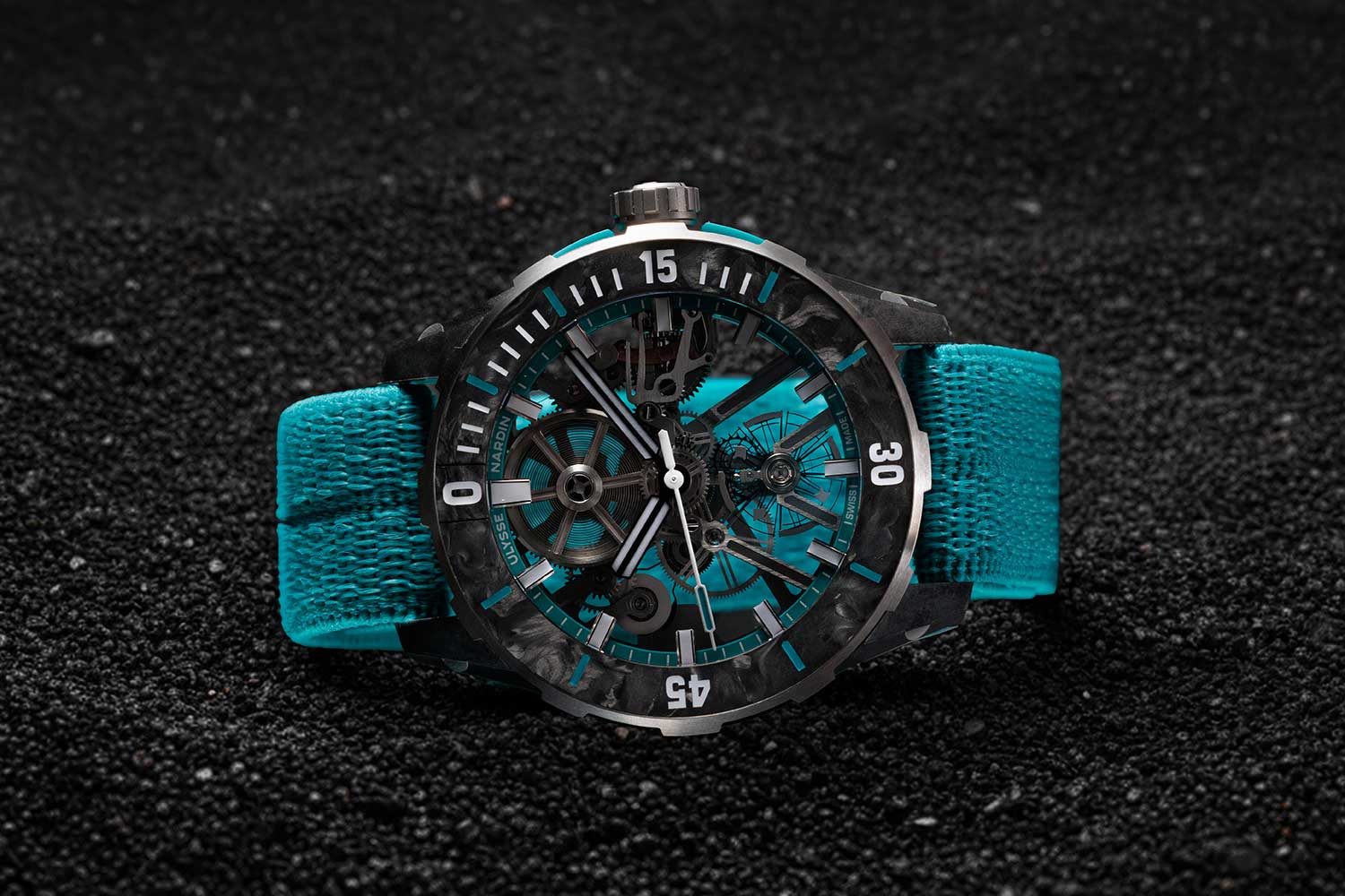 In this Seddiqi edition, that idea is expressed through a minimal skeleton dial punctuated by rhodium-finish indexes and black hands, all lifted by vibrant blue Super-LumiNova® accents. The blue theme is carried across the second hand, bezel indexes on the CarbonFoil bezel, crown protectors, elastic strap, and side plate, creating a cohesive, unmistakable signature. Performance is of course the other half of the story. The watch is water-resistant to an impressive 200 metres, yet is engineered to an astonishing 52 grams – including the strap. Power comes from the UN-374 Manufacture calibre, built in 90% recycled titanium, with an oversized silicon balance wheel, upcycled silicon escapement, with a 90-hour power reserve. Around it, the case construction continues the theme of conscious environmentalism: a 90% recycled titanium middle case, Nylo®-Foil side parts (recycled fishing nets and upcycled carbon fibres), and a CarbonFoil bezel made from upcycled carbon fibre. Turn it over and the open mineral glass caseback reveals the skeletonised calibre, finished with a personalised 75th Anniversary transfer.