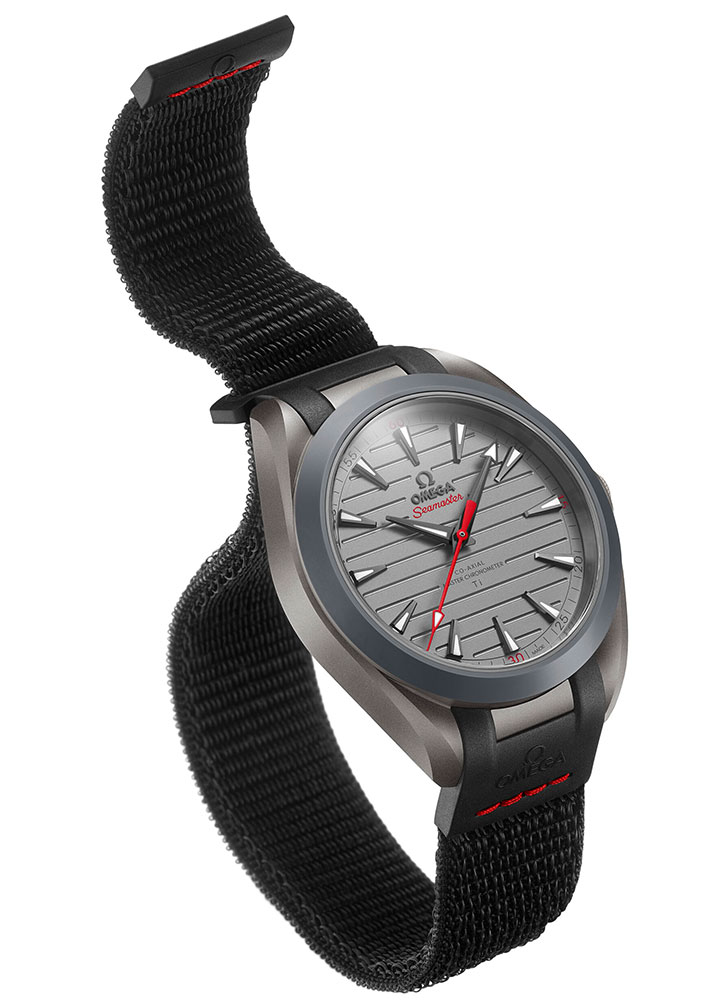 To further reduce weight, Omega minimized the material used for the dial, shaving it down just enough for a time-only display. When paired with its sporty fabric strap, the Aqua Terra UL weighs a mere 55 grams. Its sleek, aerodynamic silhouette is designed for comfort, hugging the wrist seamlessly.