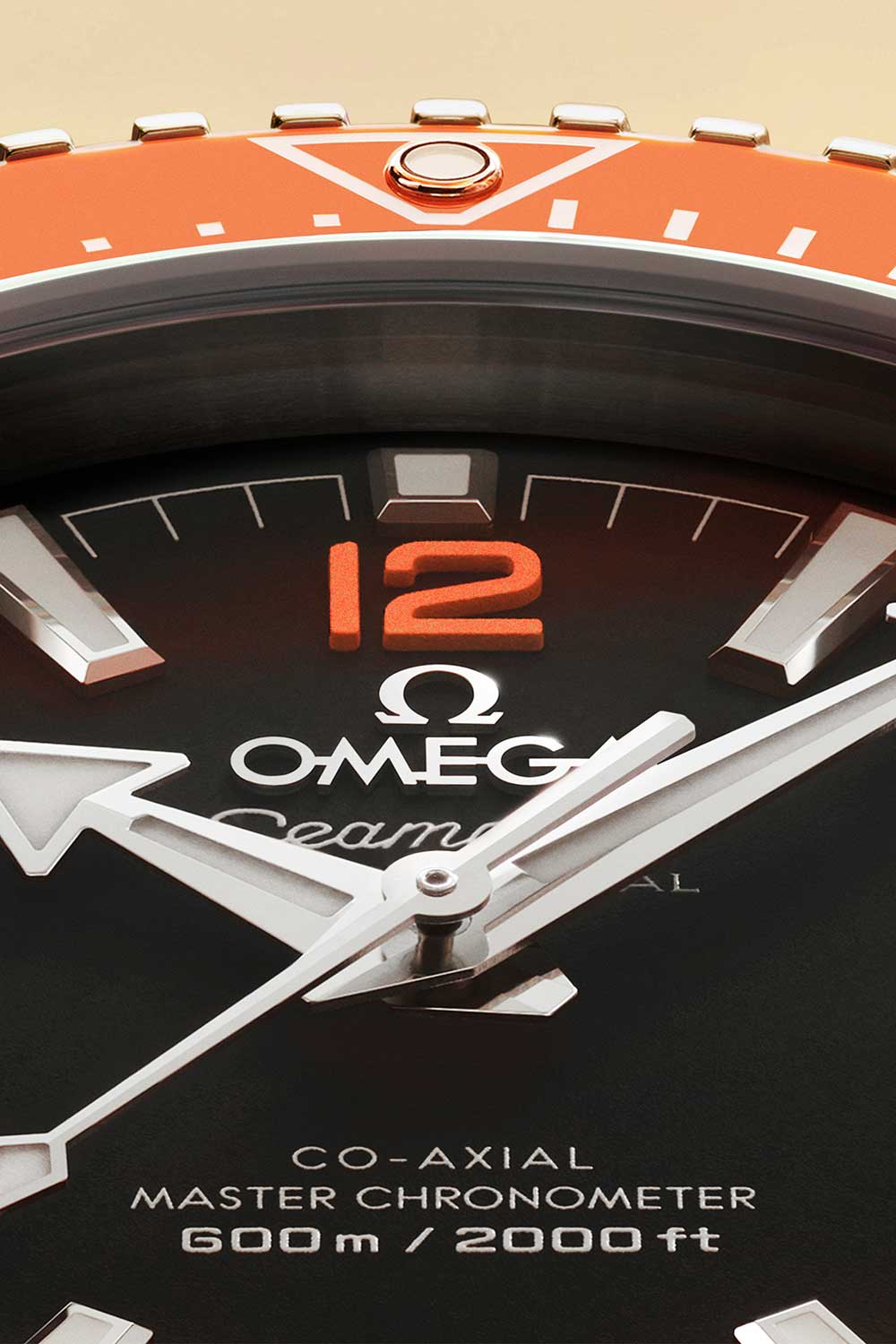 Seven models are available at launch. Three use the signature orange that has marked the Planet Ocean since 2005. Omega has invested time in refining the ceramic formulation to achieve a vivid and stable shade, and the result is used for the bezel ring and the Arabic numerals on the dial. Two references use blue ceramic with a white enamel diving scale. Two use black ceramic. Each model can be paired with a steel bracelet or rubber strap. The variety is measured rather than expansive and reinforces the idea that this is a coherent family.