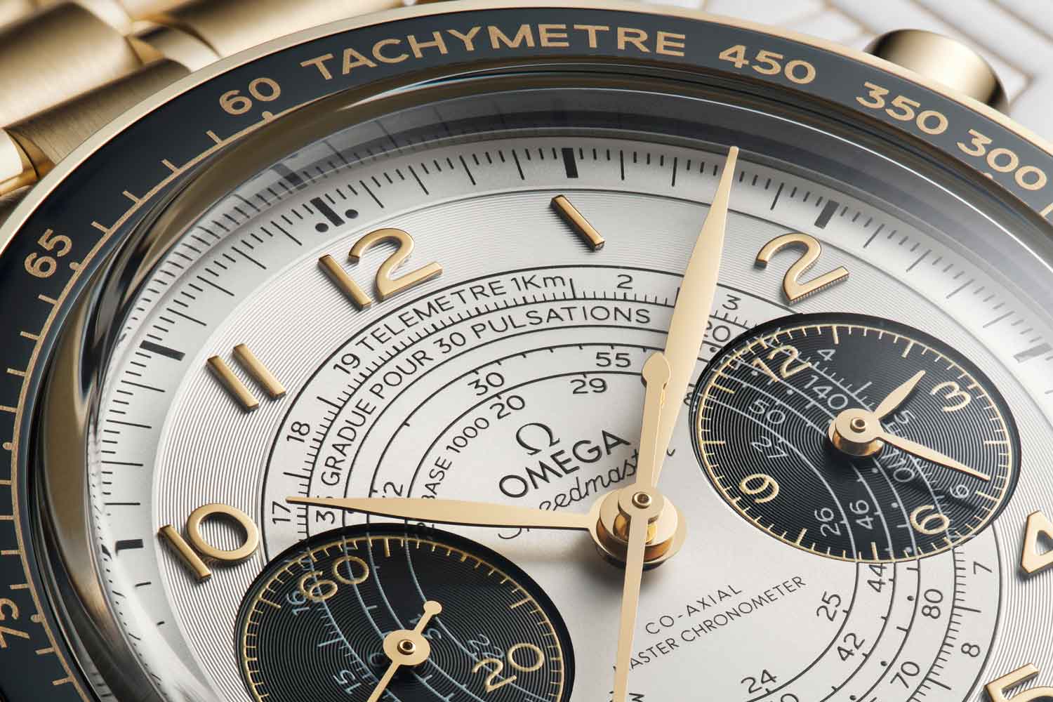 The Chronoscope, which debuted three years ago, is a modern watch that combines several fan-favorite traits from the past. Most importantly, it brings back the triple-scale design, featuring a “snail” marking that allows readings of the tachymeter, telemeter, and pulsometer. This element was common on many Omega chronographs in the 1940s. The revived triple-scale is paired with the famous Speedmaster case with “lyre” lugs that originated in the 1960s.