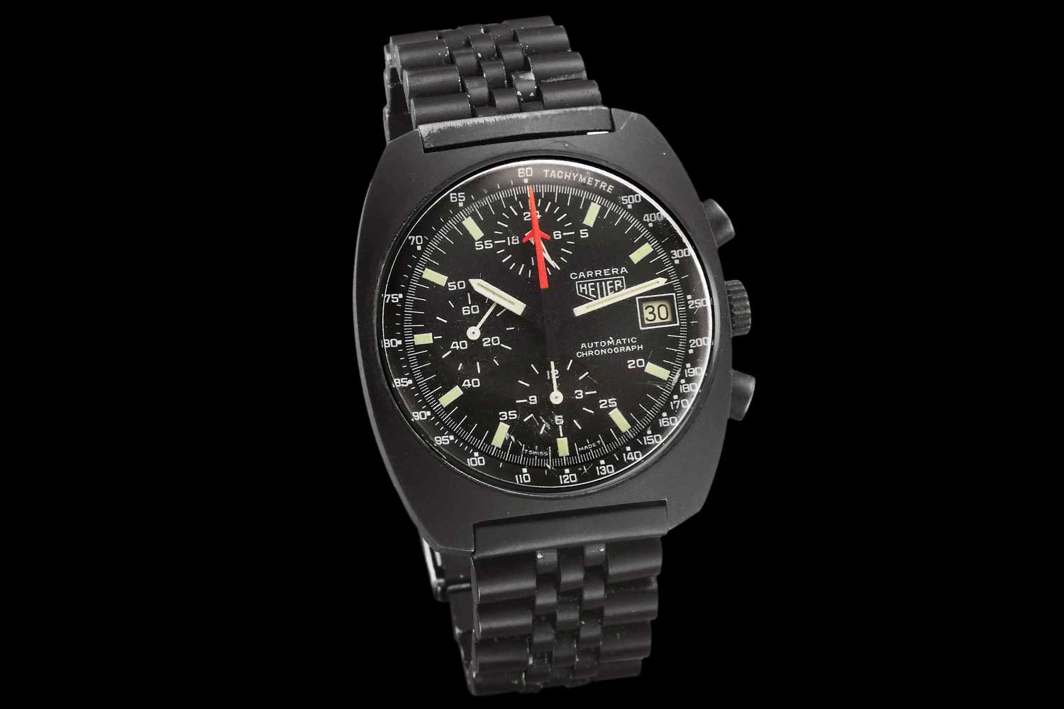 Heuer Ref. 510.511 PVD-coated chronograph, made in the 1980s that is slowly but surely showing the steel underneath its PVD-coat (Image: Antiquorum)