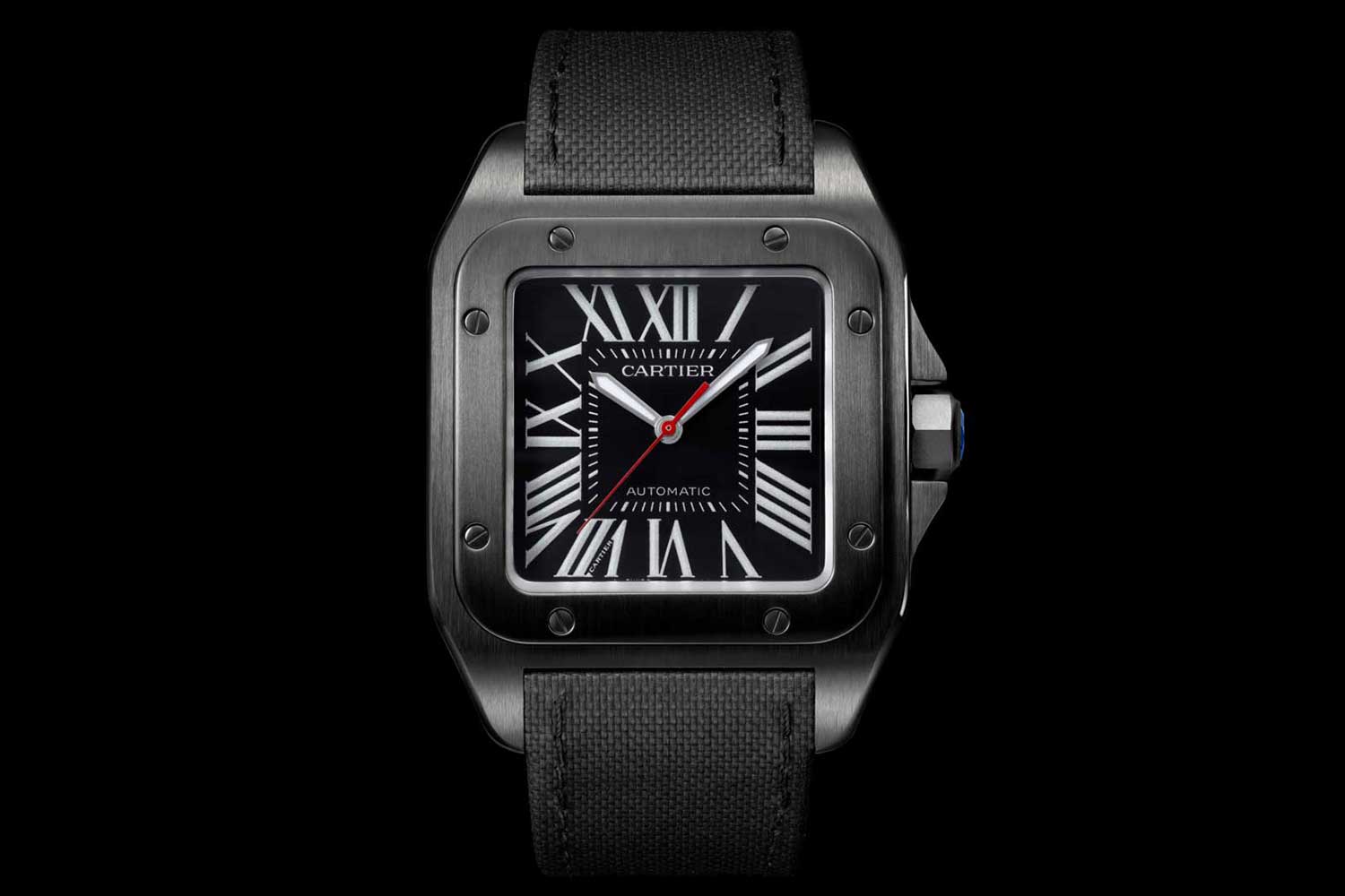 The Cartier Santos 100 Carbon watch features a 51.1 mm x 41.3 mm steel and ADLC case (Image: Cartier)