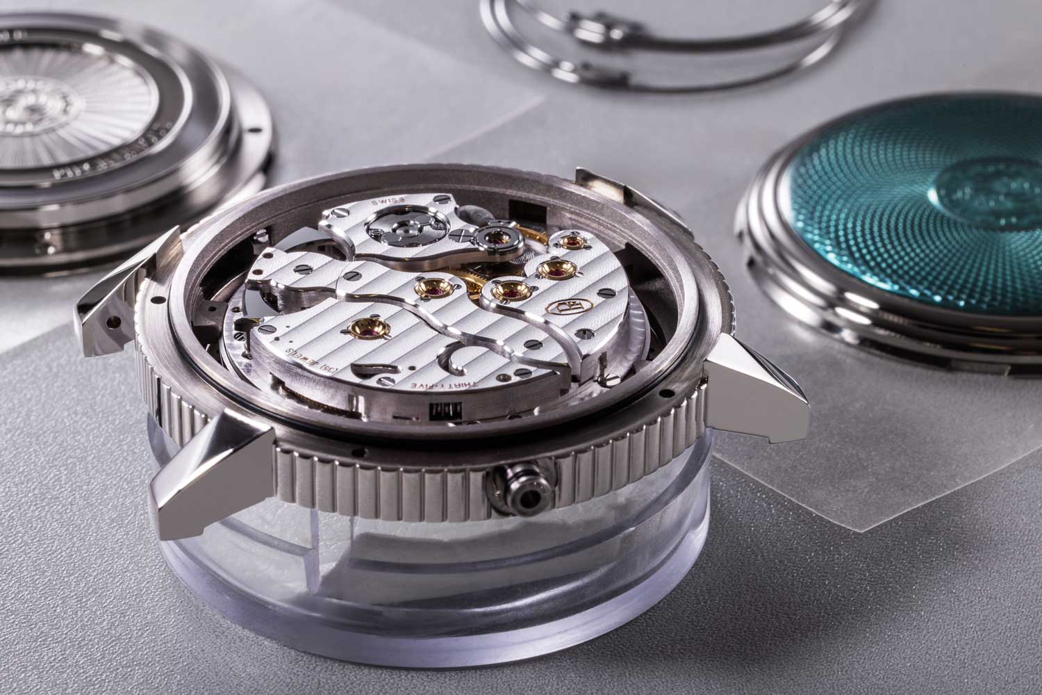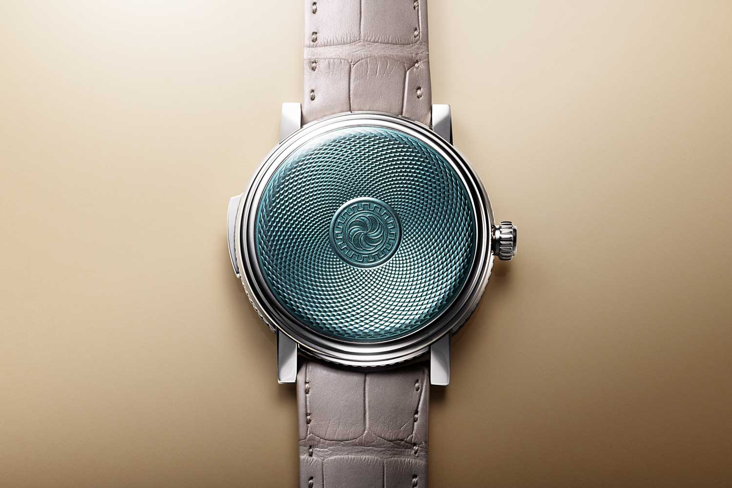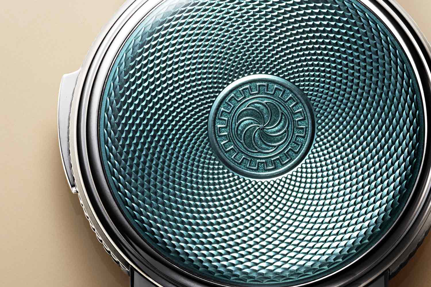 The guilloché, on the other hand, was crafted by Yann Von Kaenel, a master artisan who also collaborates with Audemars Piguet for their Code 11.59 guilloché dials. Finally, the blue-green grand feu enamel was created by Vanessa Lecci, who has previously worked with Parmigiani and Louis Vuitton on unique pieces.