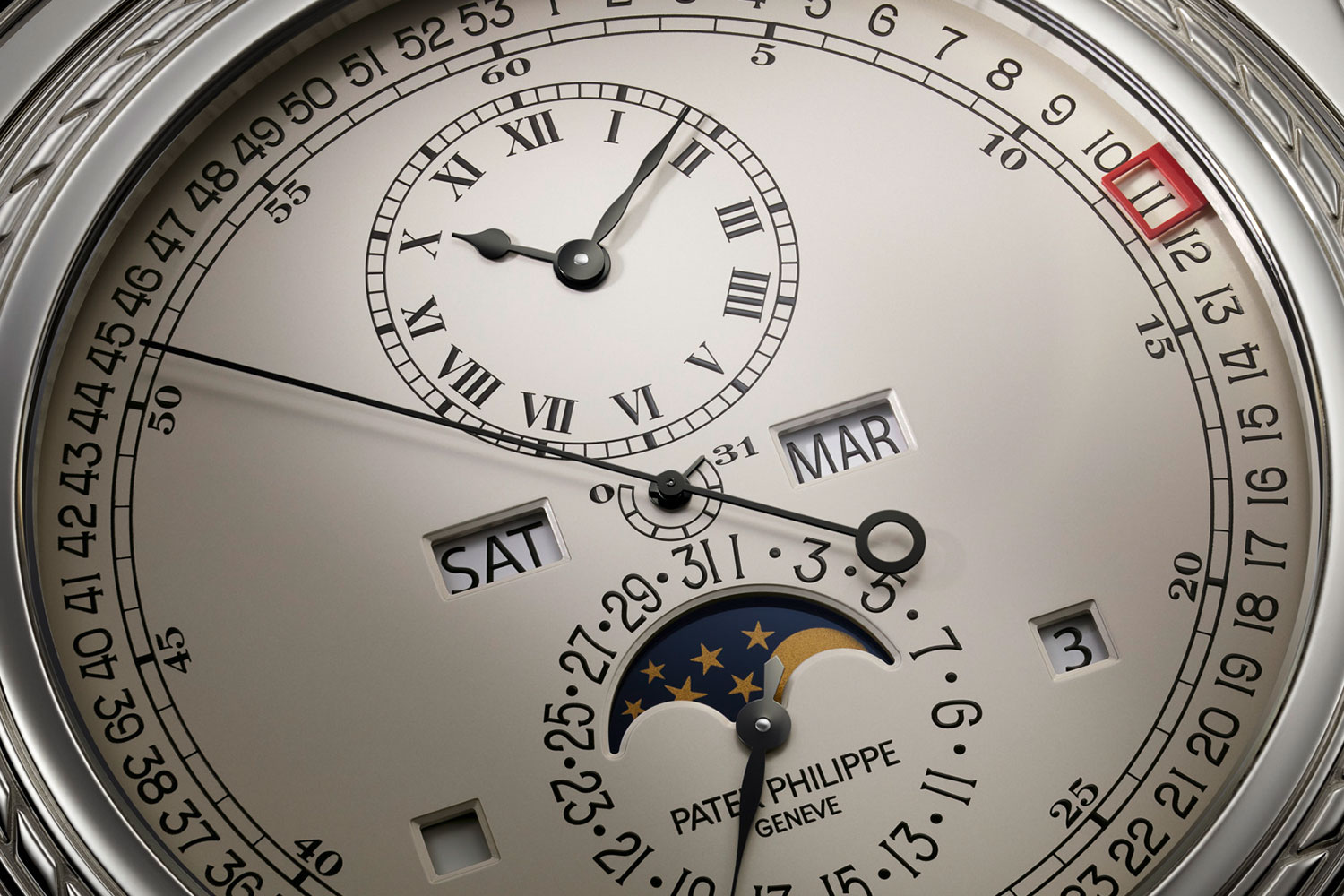 Functions: Hours and minutes; small seconds; minute repeater; instantaneous perpetual calendar (day, date, month, leap year); day/night indicator; split-seconds chronograph; moon phases