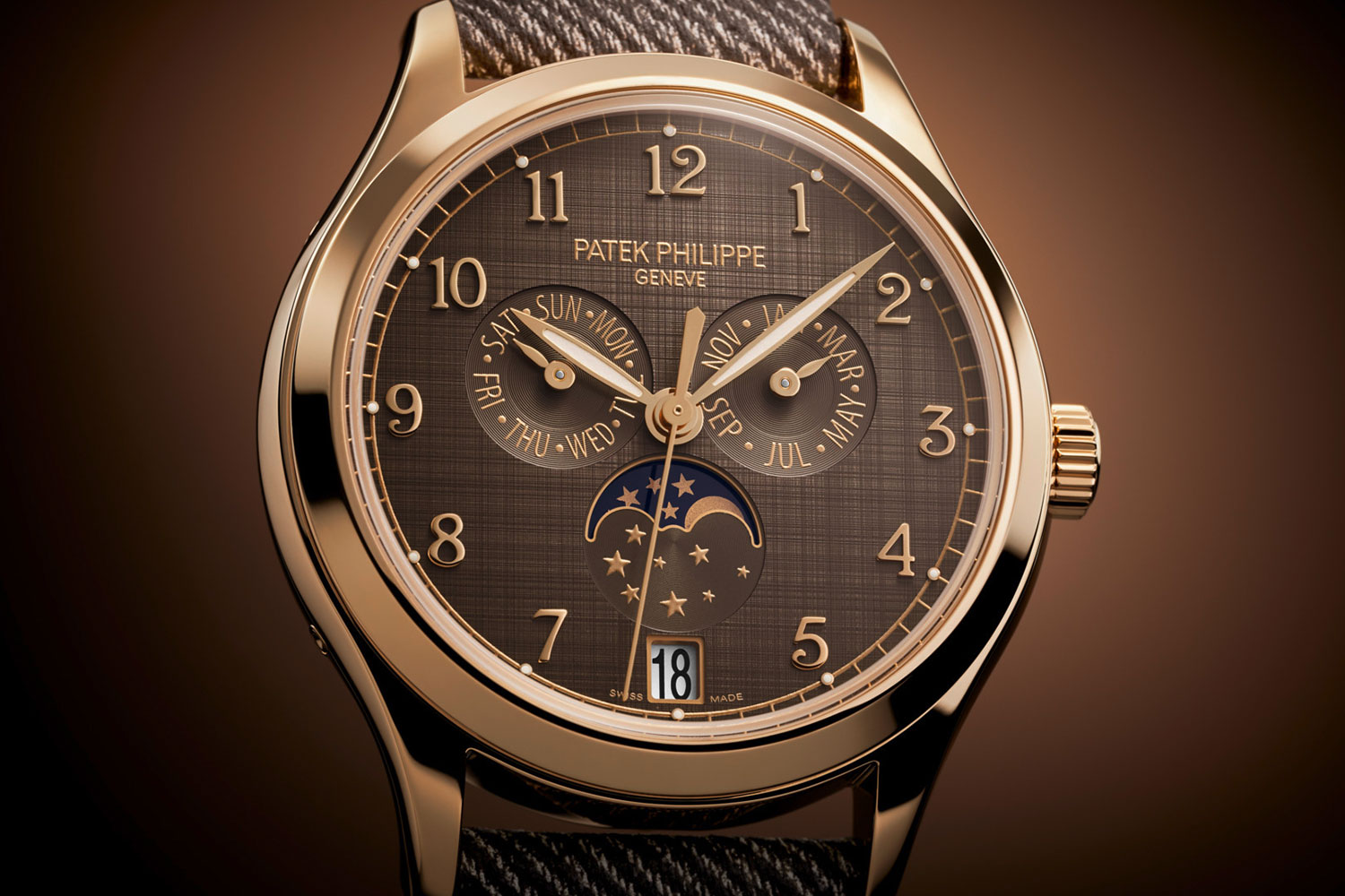 Strap: Chestnut calfskin with fabric pattern; rose gold prong buckle