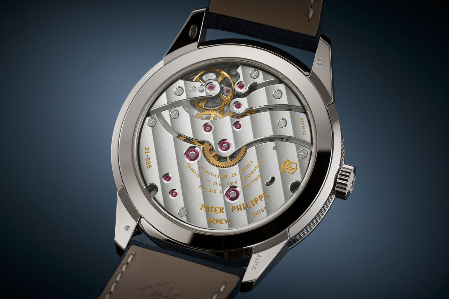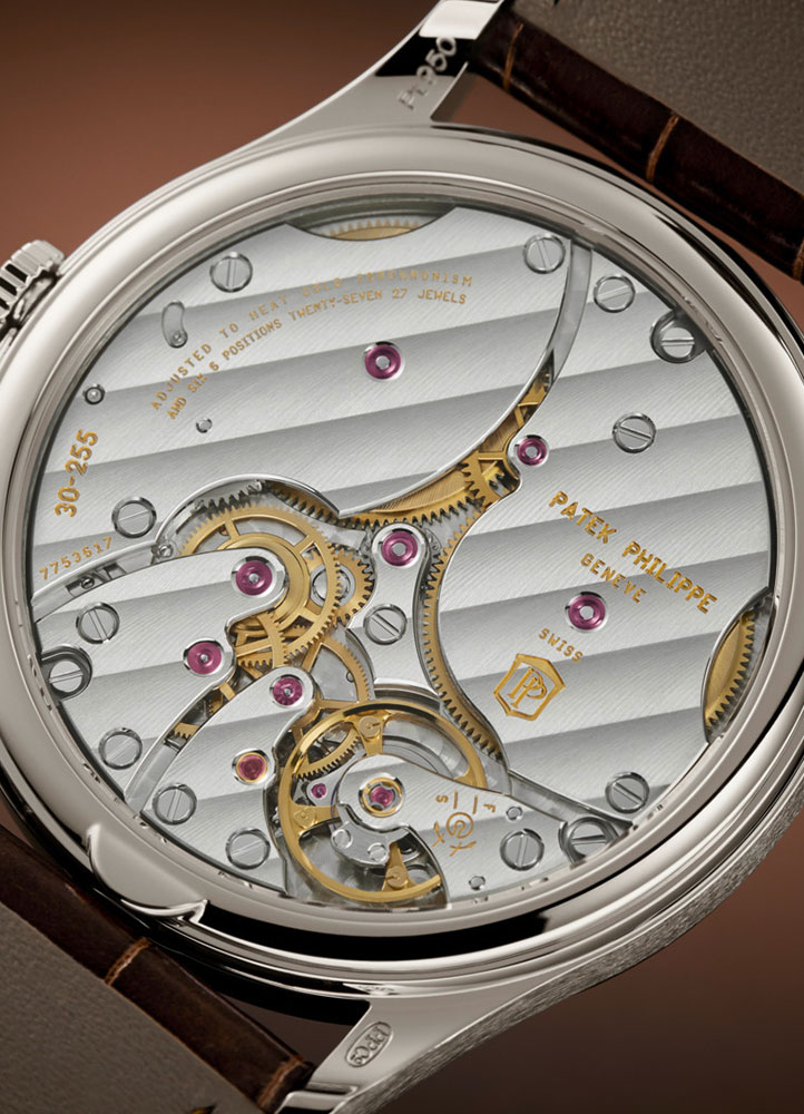 The generous power reserve has the brand new manually wound 31-505 8J PS IRM CI J caliber to thank. The movement features a Pulsomax® escapement with Silinvar® components — technology originally developed through Patek’s Advanced Research program. Dual barrels work in tandem to deliver that remarkable power reserve, with a thoughtful red indicator appearing on the ninth day to remind you it’s time to wind.