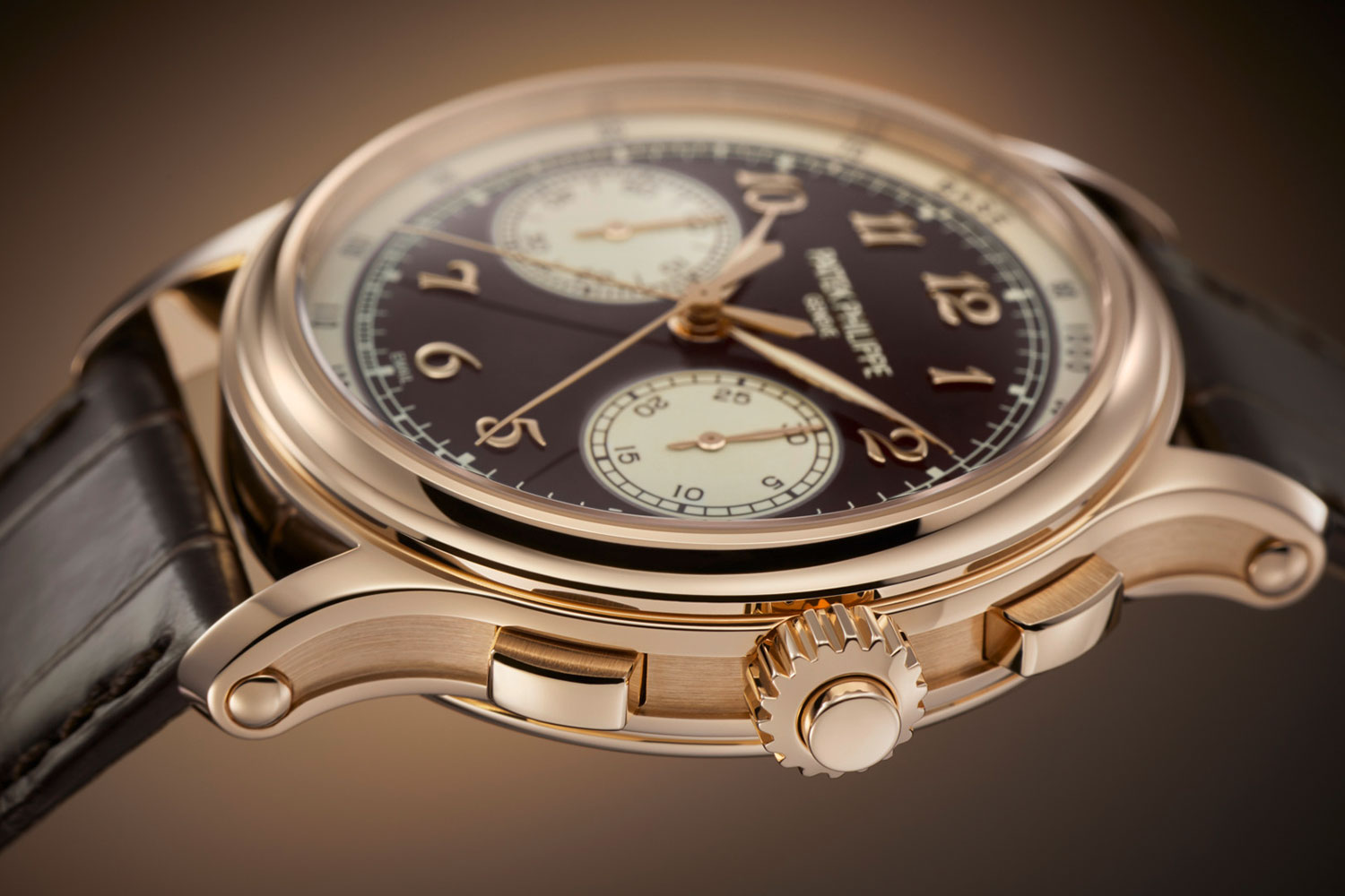 The polished rose gold case exudes refinement with its concave bezel and recessed, satin-brushed flanks, and finished in a dark brown alligator strap.
