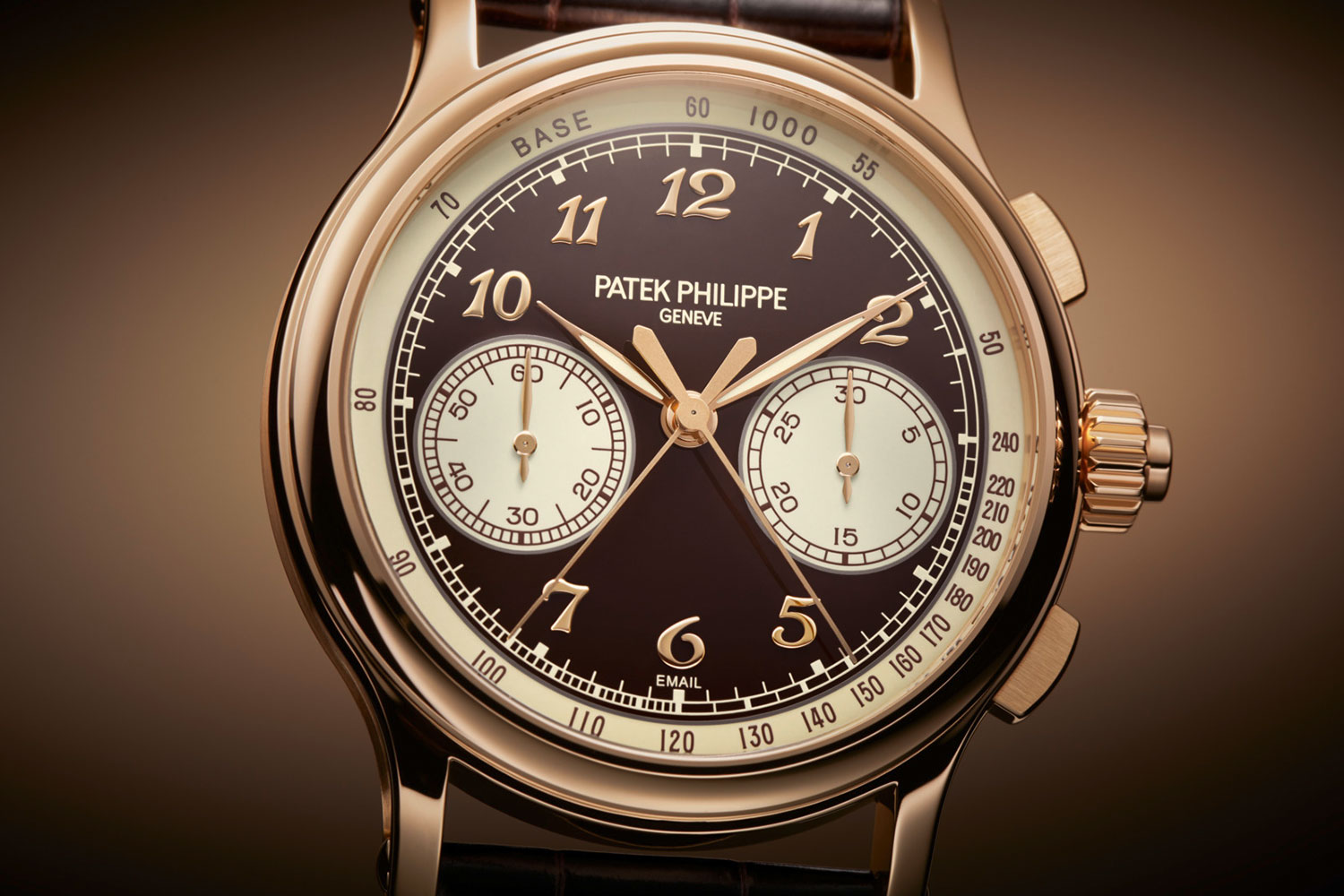 The new 5370R-001 features a two-tone Grand Feu enamel dial — brown with beige champlevé enamel subdials and a tachymeter scale — created through an incredibly complex process on an 18K gold plate. The color combination is charmingly retro-esque, though it lends excellent legibility too, enhanced by rose gold leaf-shaped hands with luminescent coating and applied rose gold Breguet numerals.