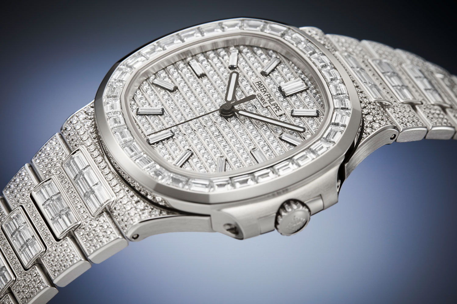 Diamonds take center stage here. 1,285 brilliant-cut diamonds (6.43 carats) blanket the dial, bracelet, and case, while 195 baguette-cut diamonds (13.27 carats) punctuate the bezel, bracelet links, and hour markers. The interplay of different cuts highlights the Nautilus’ signature octagonal shape, ensuring maximum brilliance without compromising the watch’s proportions.