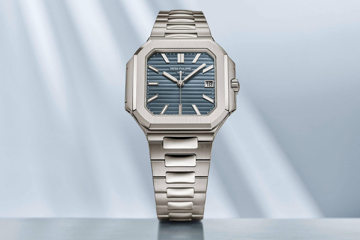 Within the white gold case that features Patek’s signature hobnail guilloché pattern around its entirety, a textured blue dial with its gradient black rim creates a perfect backdrop for the applied white gold numerals and luminescent hands. It comes with two interchangeable straps and a new patented triple-blade clasp designed for both safety and comfort.