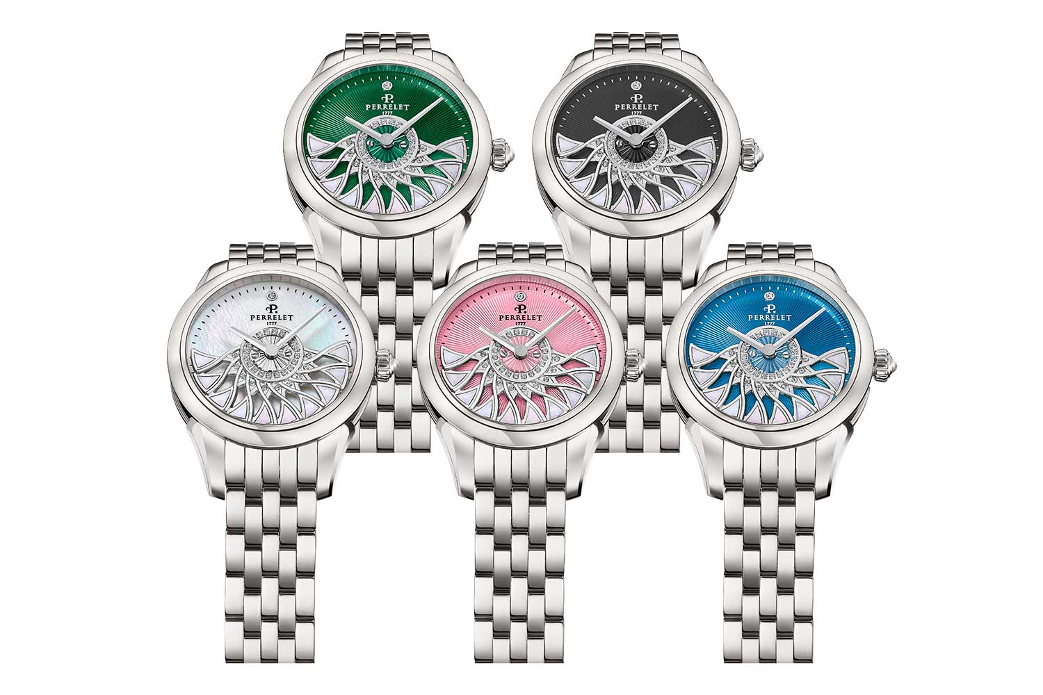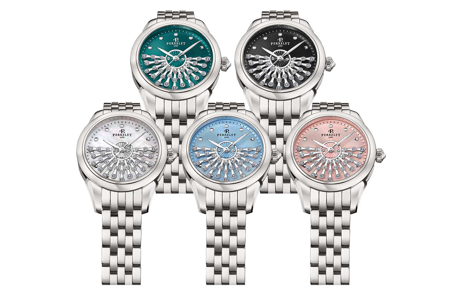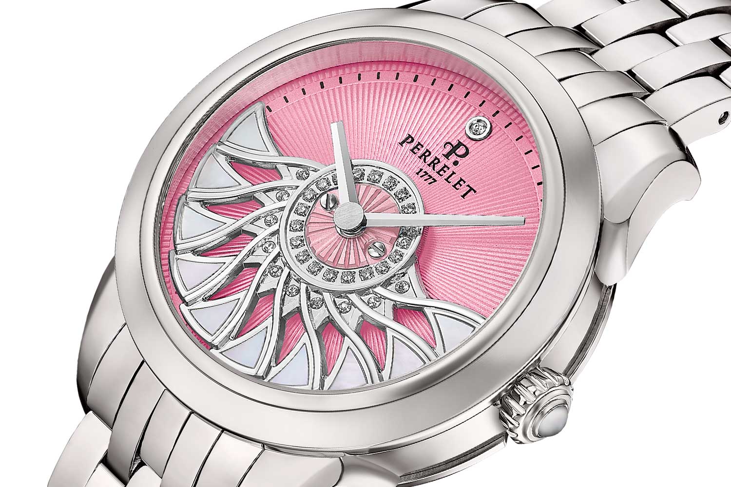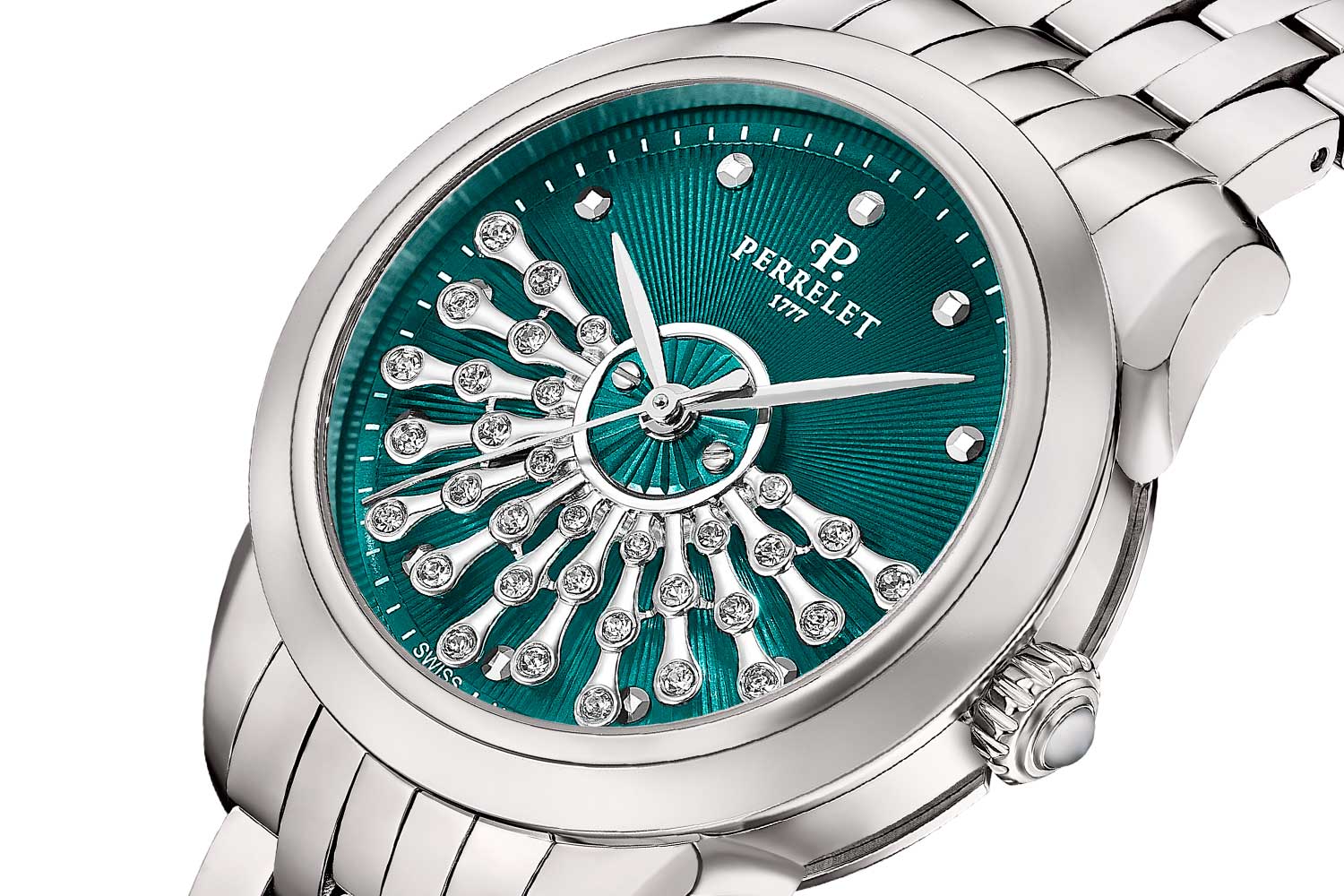 Both horological homages are crafted in grade 2 titanium, which gives them a lightness and modernity. The 36.5 mm cases are available with either a polished bezel or one set with 64 diamonds, and are paired with five-row titanium bracelets or colour- matched leather straps. Dial colours – from contrasting black and white to warmer shades of pink and blue, to original shades of green. Inside beats the calibre P-181-H, an in-house automatic movement engineered specifically to accommodate the Double Rotor. With 26 jewels, a 42-hour power reserve, and decoration including circular graining and Côtes de Genève, it confirms Perrelet’s dedication to haute horlogerie standards even within jewellery-oriented pieces. The rotor on the caseback is openworked and snailed, while the visible dial- side rotor turns on a ruby for reduced friction, ensuring mechanical integrity matches aesthetic ambition.