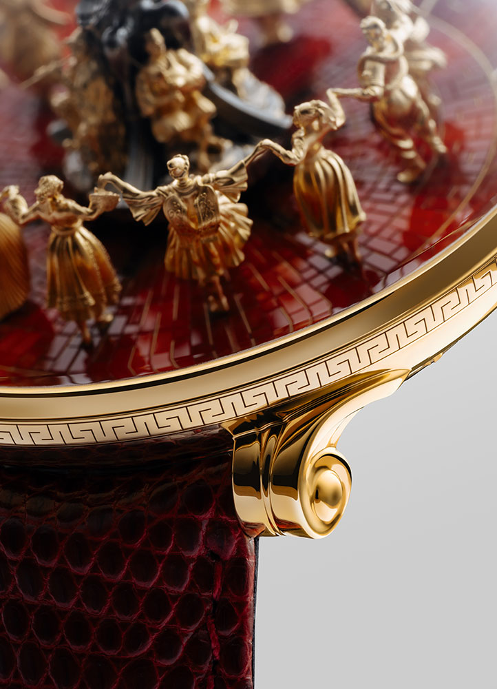 The timepiece, which reportedly took five years in the making, features an extravagant dial display comprising 16 micro-sculpted Albanian folk dancers made out of 18K yellow gold. These figurines, each one representing the hours (in addition to four in the center piece) and the country’s 12 regions, measure just 9mm to 10mm in height and are rendered with hyper-realistic detail. They’re all enclosed underneath an anti-reflective sapphire crystal dome within a 46.5mm 18K yellow gold case.