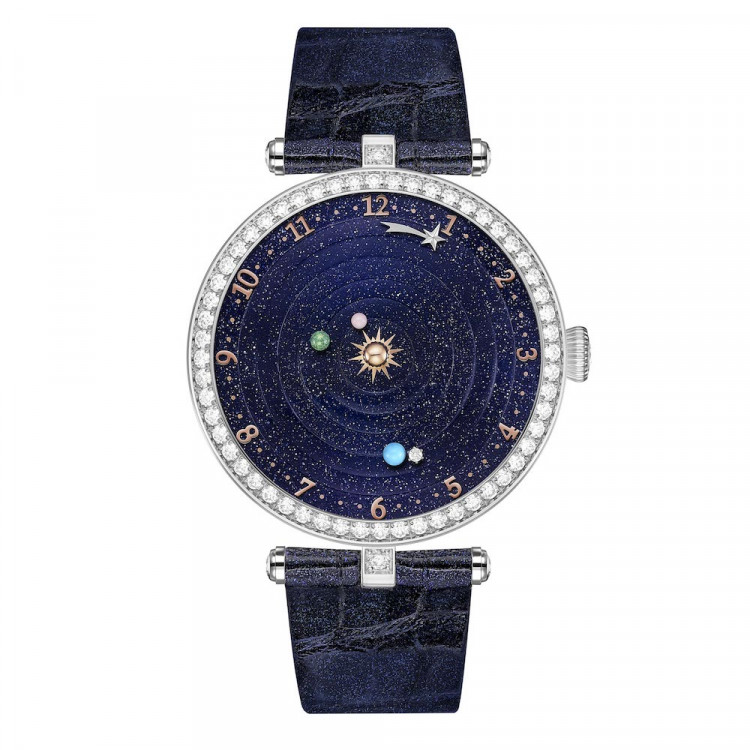 Held within a 38mm white gold case, decorated with diamonds around its bezel, the watch’s aventurine dial sets the stage for the cosmic ballet performed inside of the Lady Arpels Planétarium.