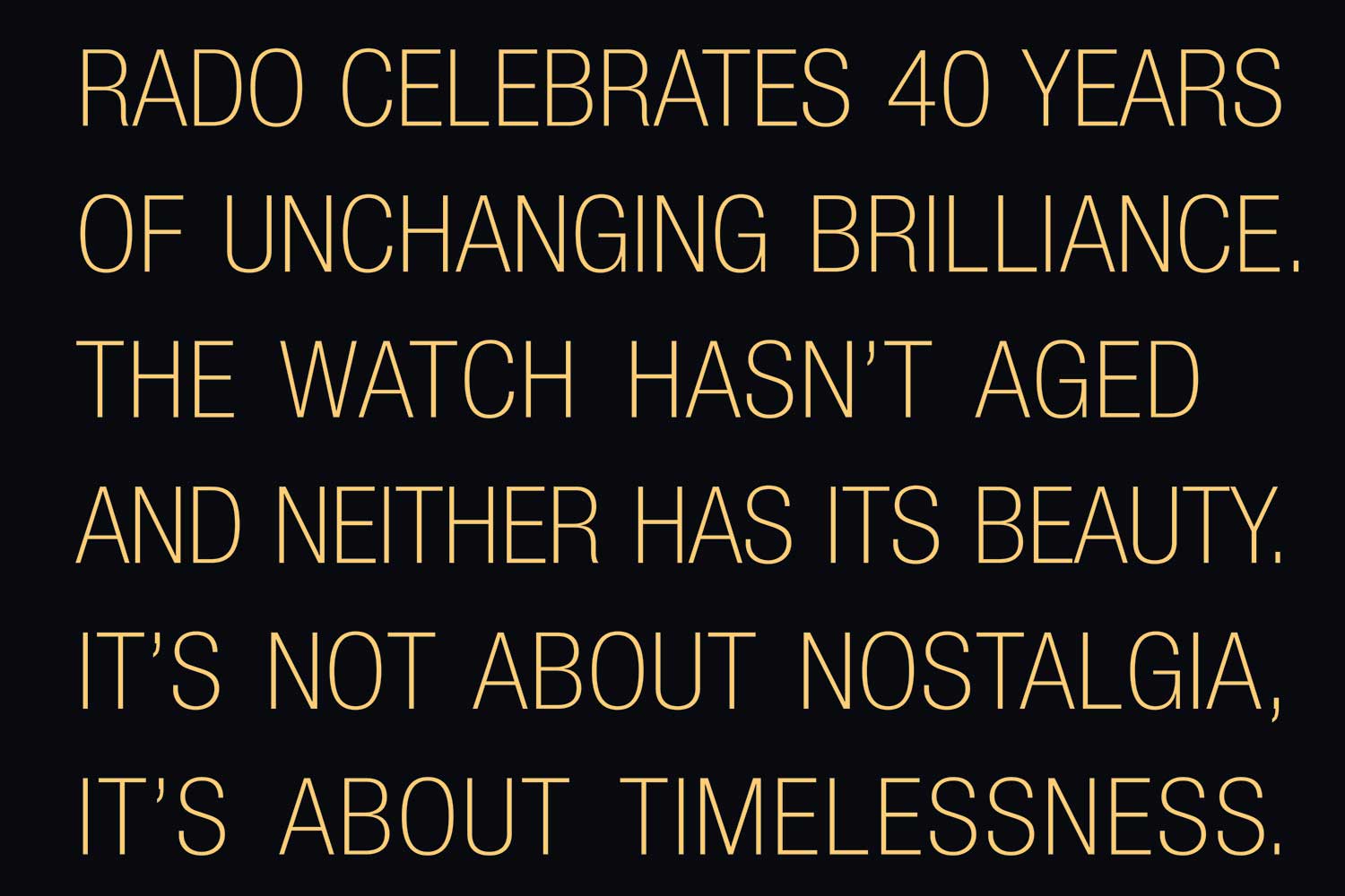 Eternal beauty has always been linked to the idea of lasting value – something that stays meaningful and untouched as time goes by. In the early days, this idea focused more on longevity than on the nuances of aesthetics. It was less about defining what beauty looked like, and more about ensuring that it could remain unchanged for as long as possible. When this philosophy met the world of Rado, it opened the door to major innovation. The desire to protect beauty over time led to new materials and technologies designed to keep a design true to its original vision, even decades later. With time, the understanding of eternal beauty expanded. It came to include not only technical mastery but also the creative vision of exceptional designers whose bold, original ideas deserved a long life of their own. Form and function became a powerful pair – both essential, both celebrated – perfectly reflecting one of the guiding beliefs of Rado’s founders: “If we can imagine it, we can make it. And if we can make it, we will.”