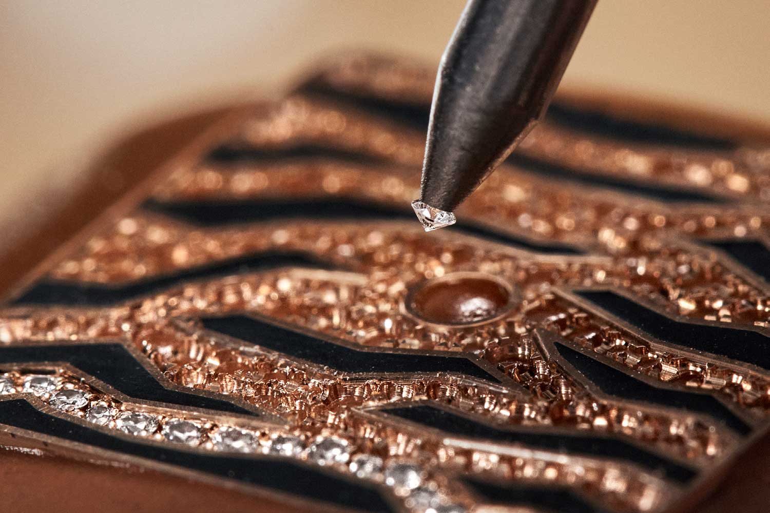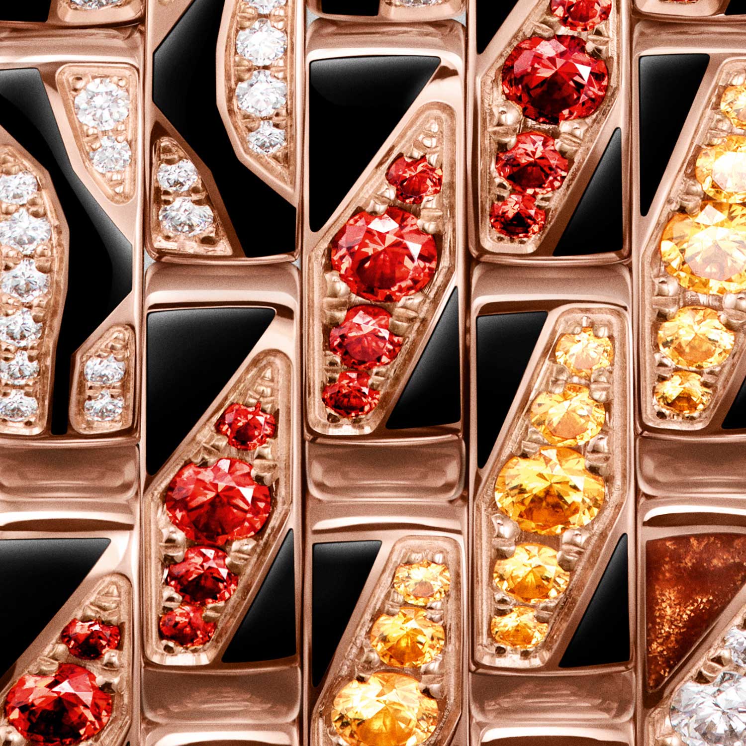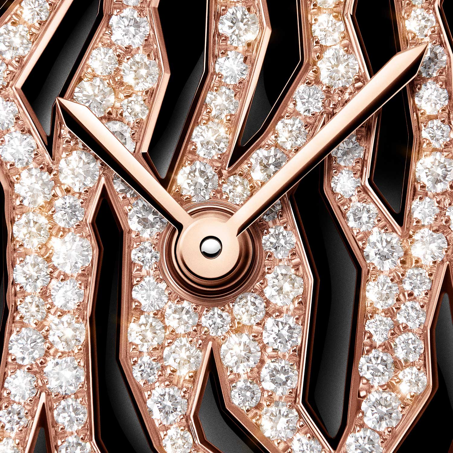 The newest rose gold variation takes that approach to a bold graphic, gem-laden extreme: the time-telling aspect of the watch taking a discreet second place to the all-over graphic skin, with lacquer and stone-setting that flow uninterrupted from dial to case to bracelet, deliberately abstract stripes evoking zebra or tiger markings.
