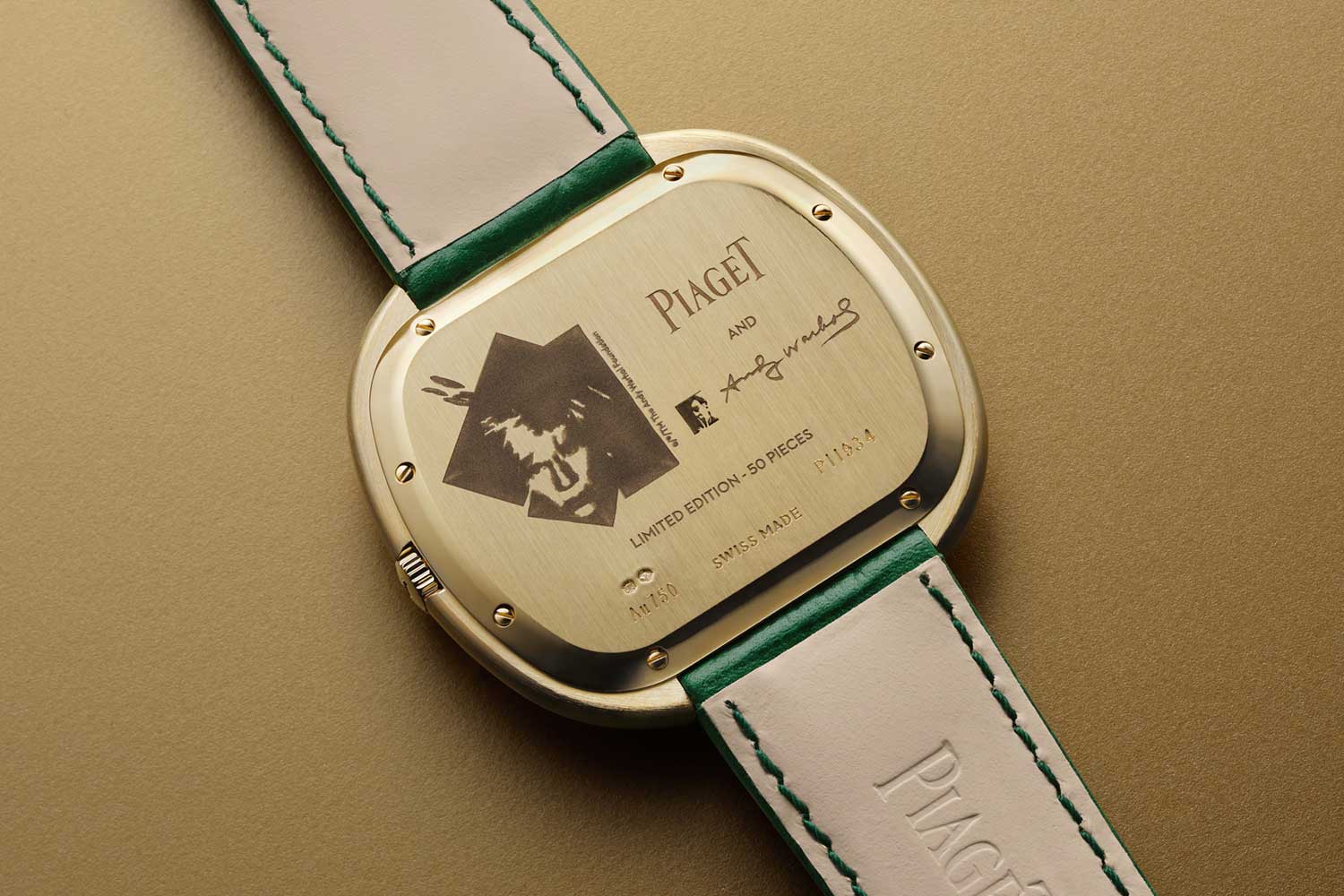 An engraving of Warhol’s 1986 Polaroid collage self-portrait, accompanied by Piaget’s logo, the Foundation’s insignia, and Warhol’s own signature