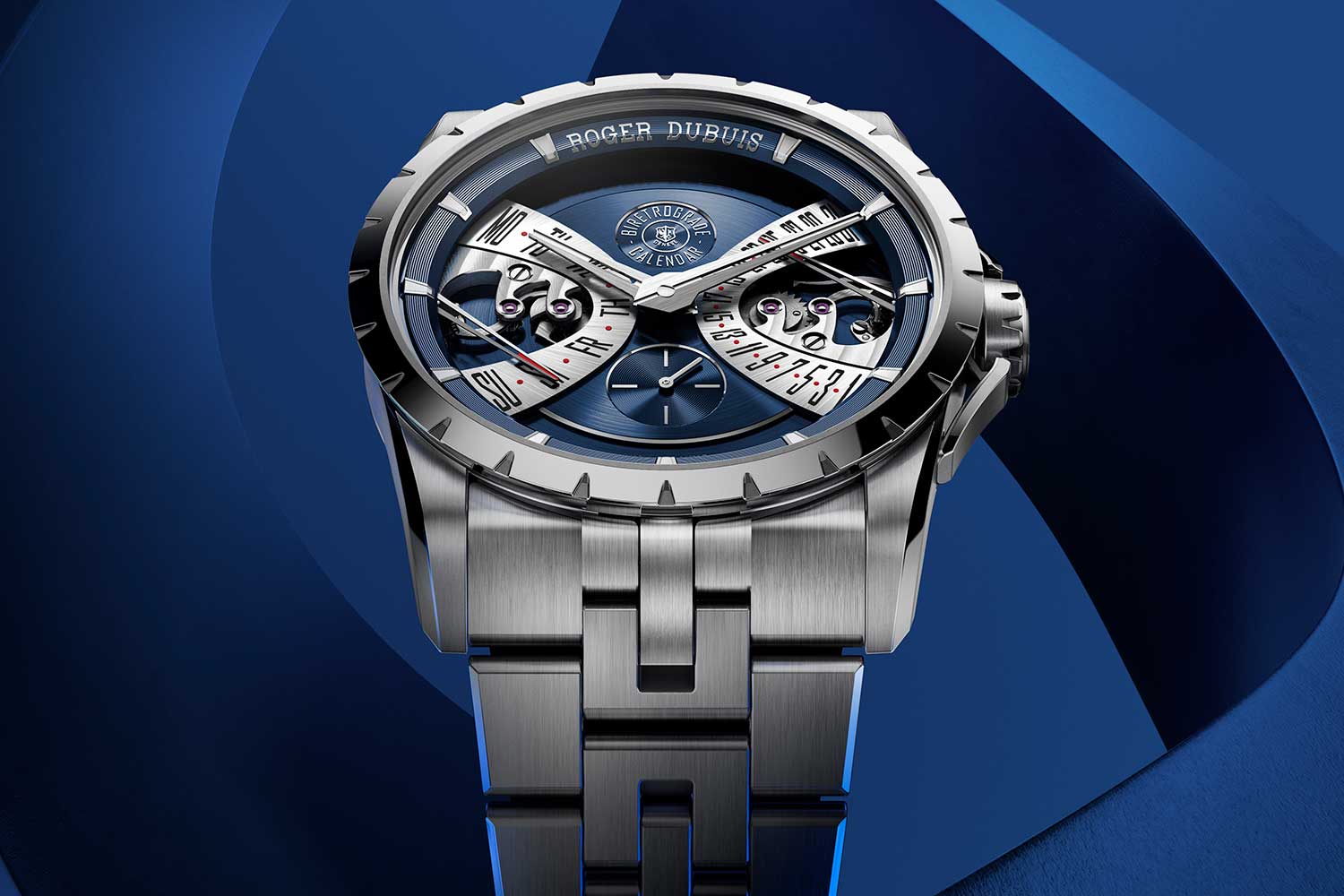 The Roger Dubuis Excalibur Biretrograde Calendar pairs its Cosmic Blue dial with a 40mm steel case and integrated bracelet for a sport-chic expression of the complication