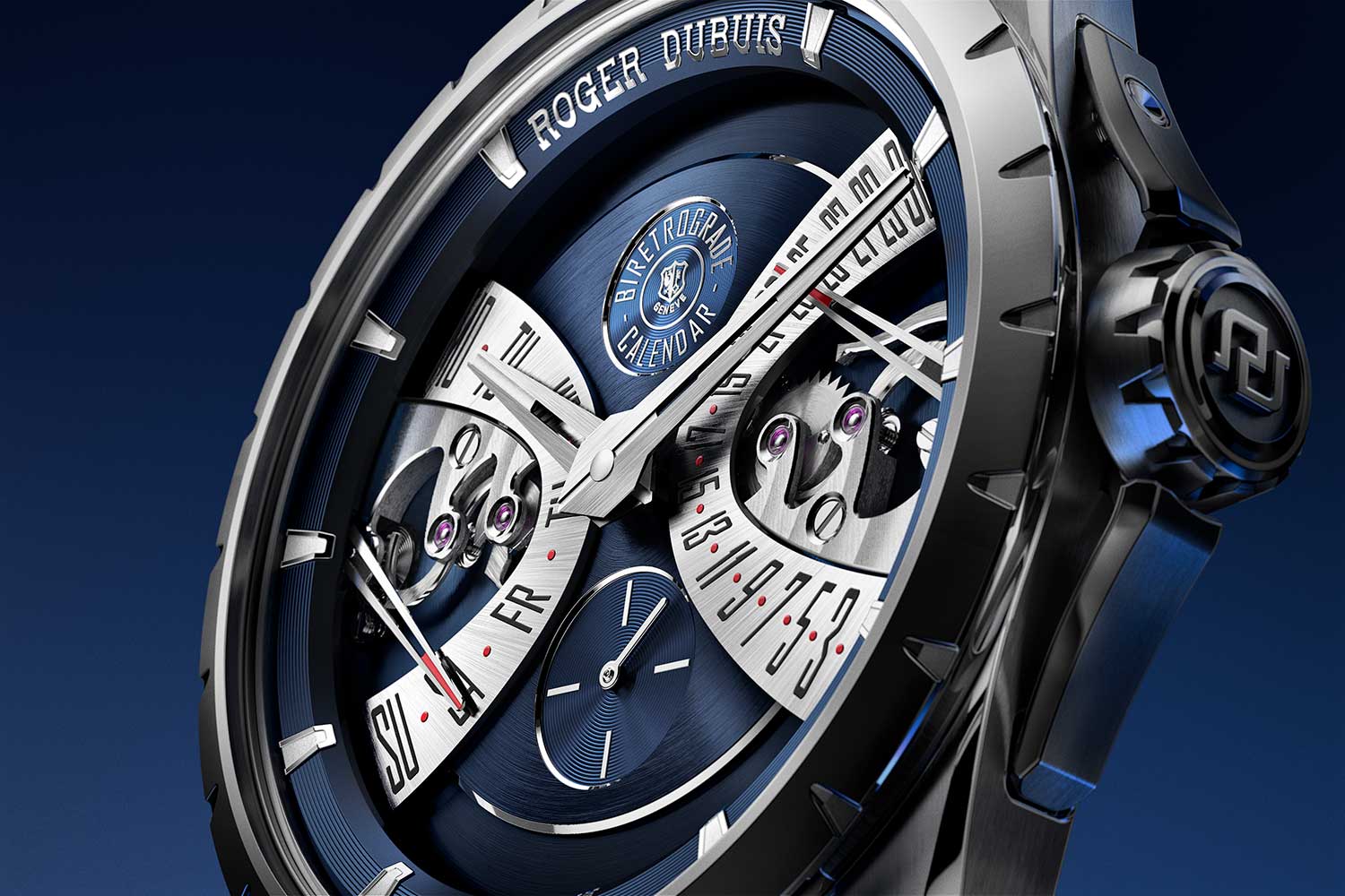 Roger Dubuis Excalibur Biretrograde Calendar in Cosmic Blue, highlighting the signature twin retrograde day and date displays across a multi-layered dial