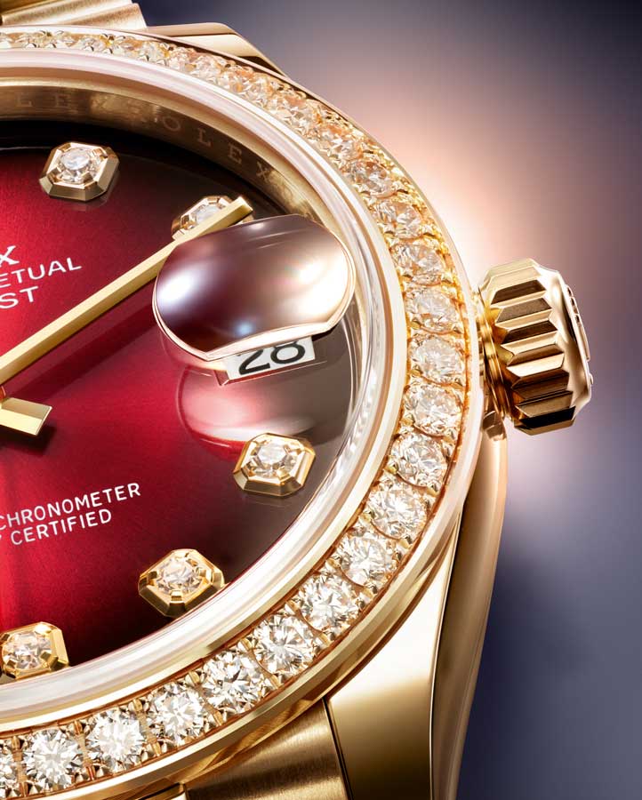 Joining the array of Rolex Watches and Wonders 2025 novelties is this fiercely elegant number. The Oyster Perpetual Datejust 31 brandishes a stunning new red ombré dial encircled by a ring of round brilliant cut diamonds. Dancing with the light, the sensuous chiaroscuro effect is further enhanced by diamond hour markers.