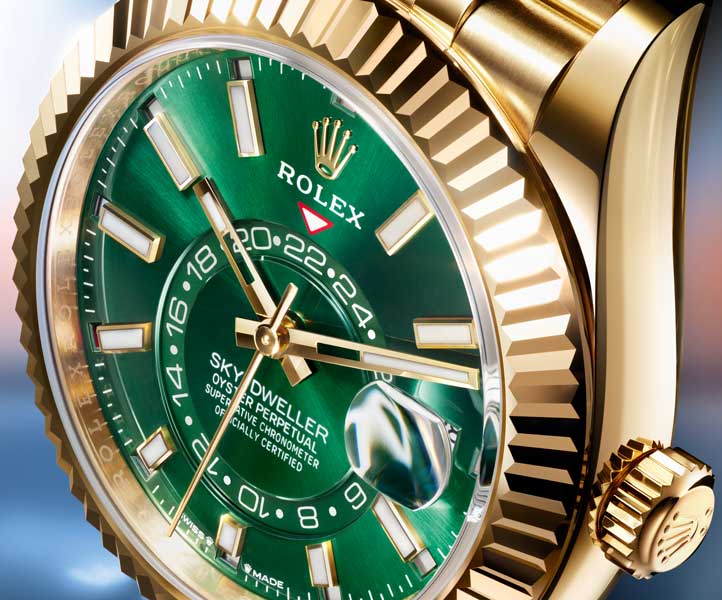 Rounding up the collection is a new Sky-Dweller in 18K yellow gold with a bright green dial, worn on the Jubilee bracelet fitted with the Oysterclasp.