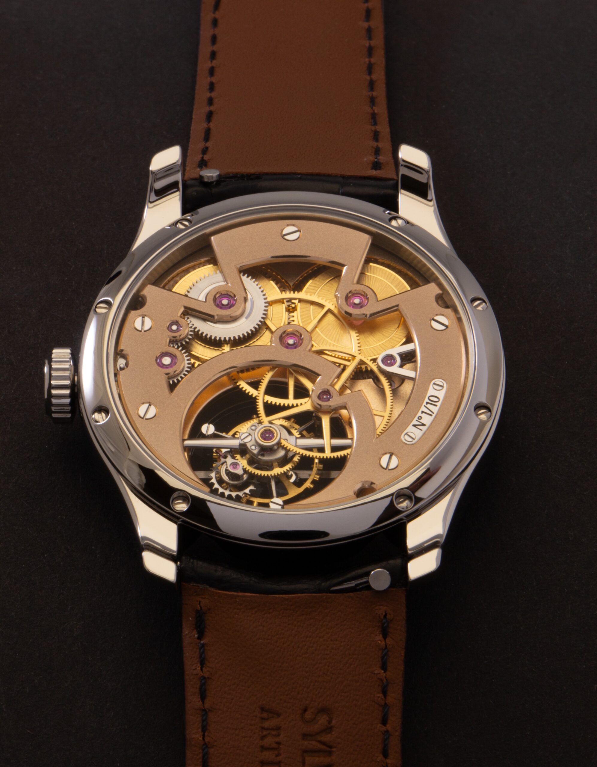 The view on the reverse is dominated by a bridge design that is both striking and unexpected. It has a single, full-bridge spanning the train, with an outline that combines broad curves with sharp angular turns. While it was most definitely intended to showcase finishing skill, it also lends the movement a certain dignity. It frames the train clearly, with a direct and easily readable flow of power. The going train is straightforward, starting from the barrel, to the second and third wheel, which then drives the tourbillon cage. Additionally, the third wheel drives an auxiliary pinion, which powers the seconds hand visible on the dial side.