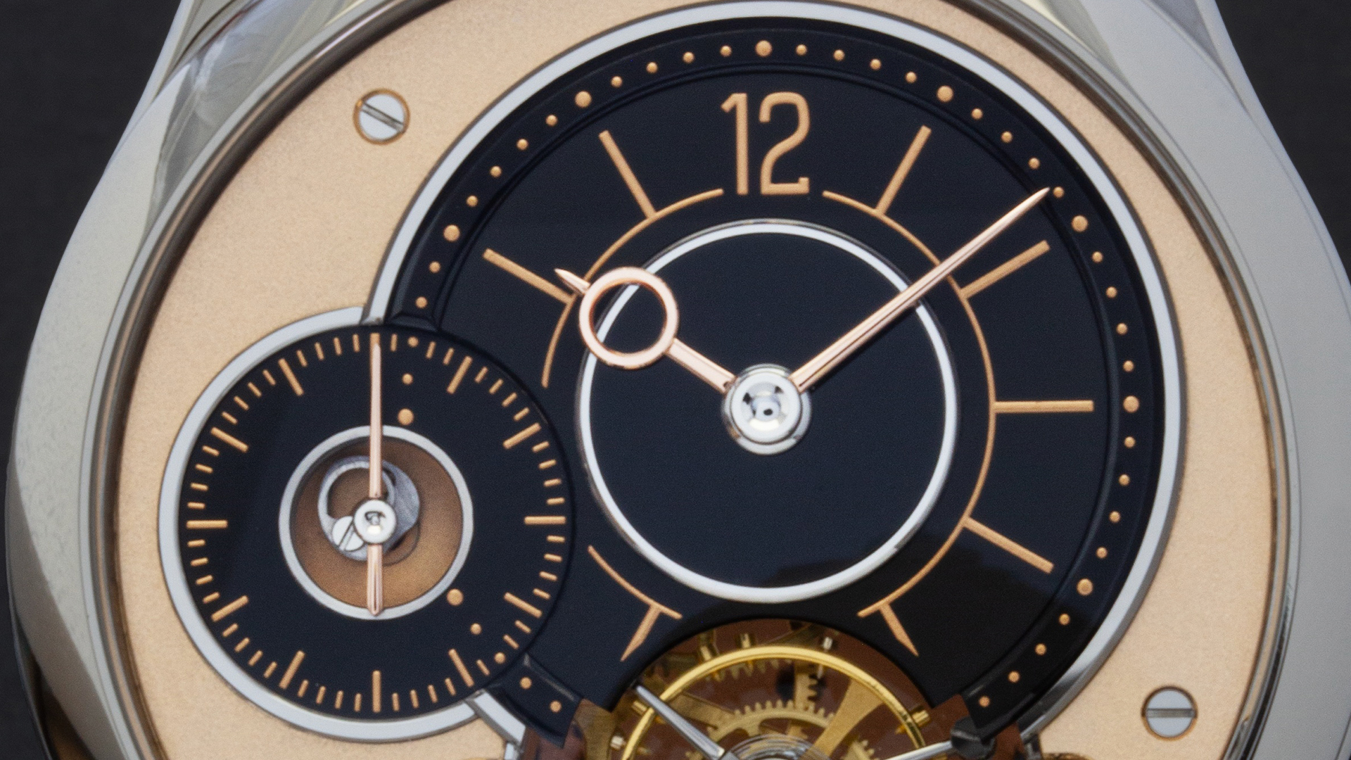 Detail of the off-centred hour and minute display paired with the small seconds subdial, revealing the layered construction and asymmetrical balance of the dial