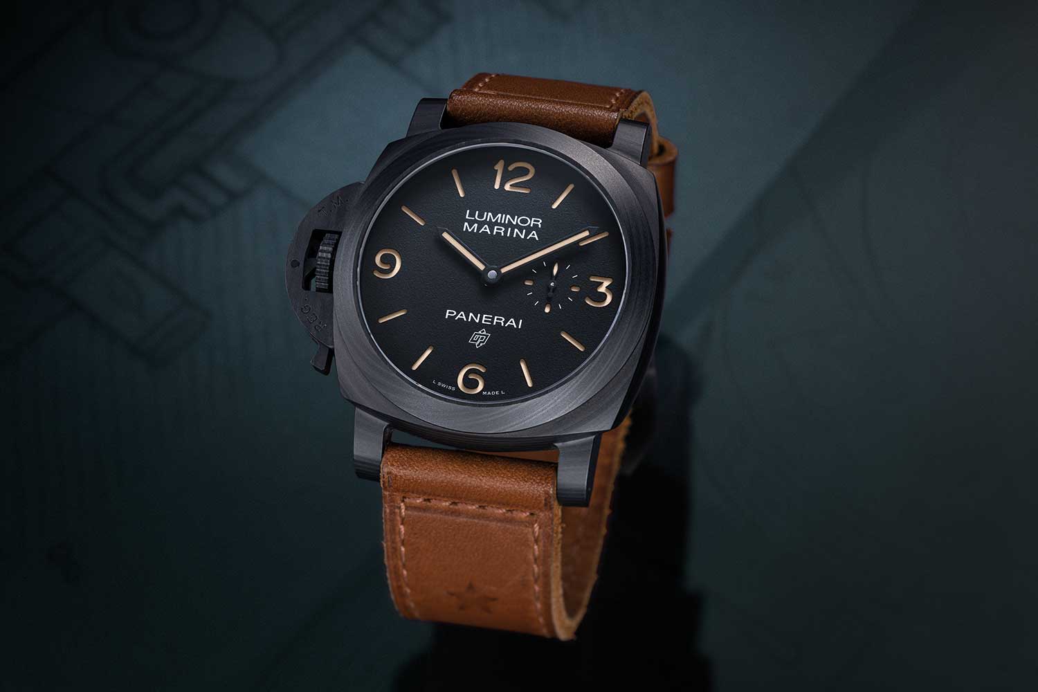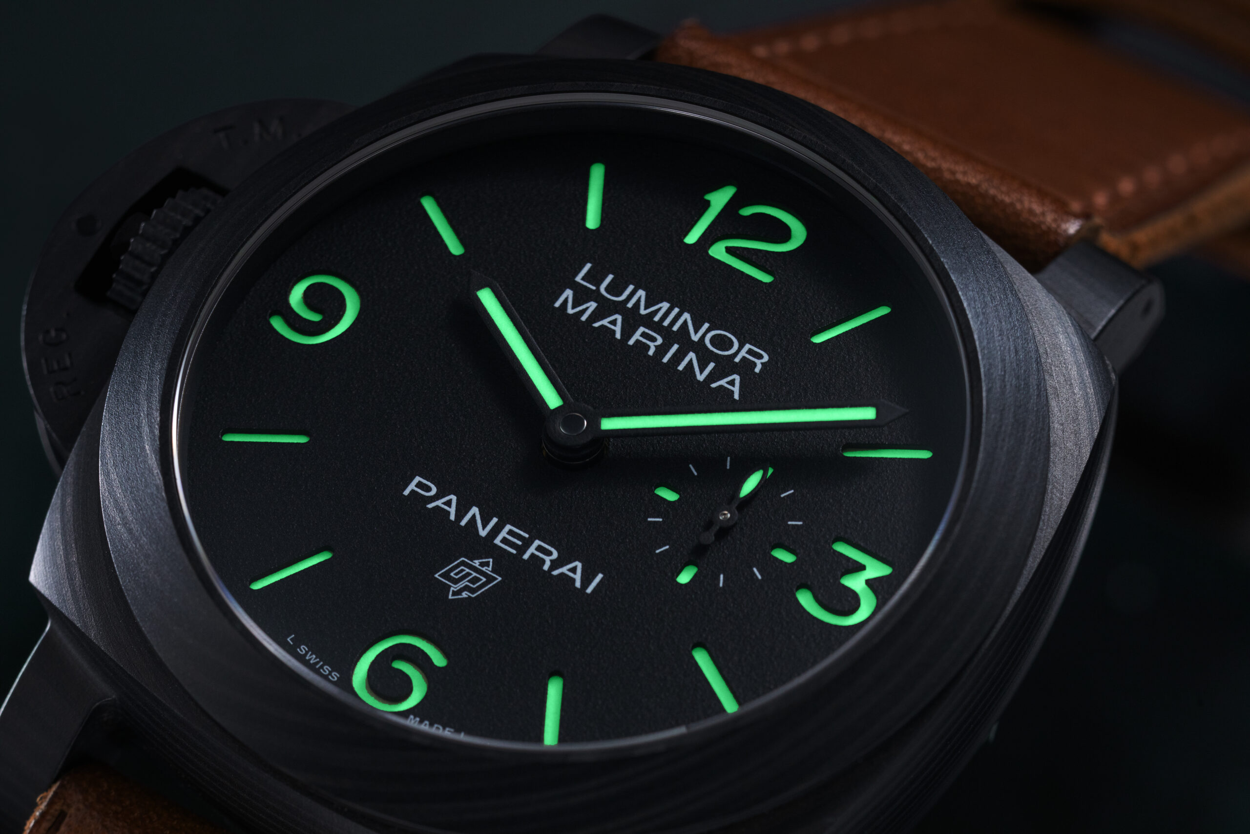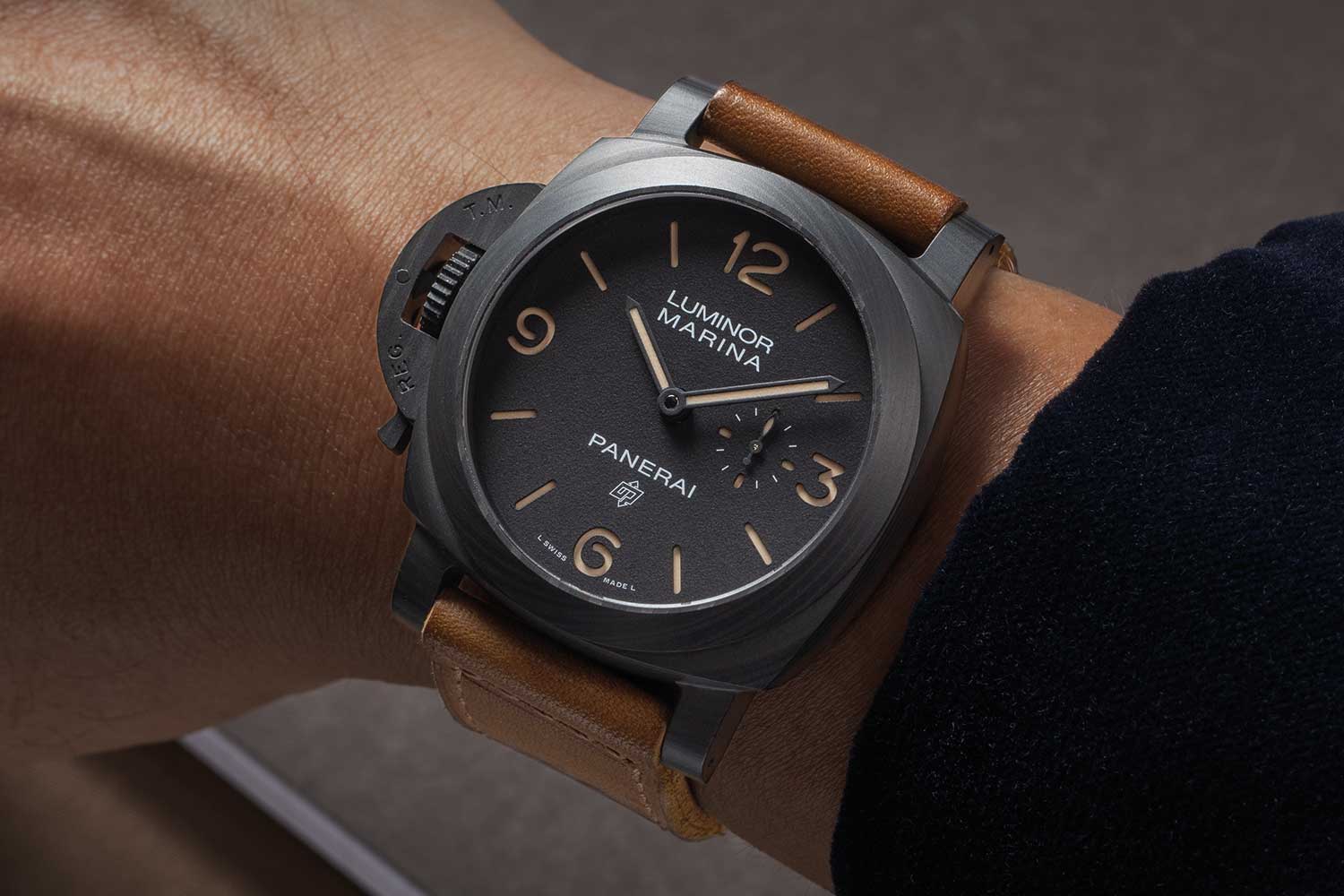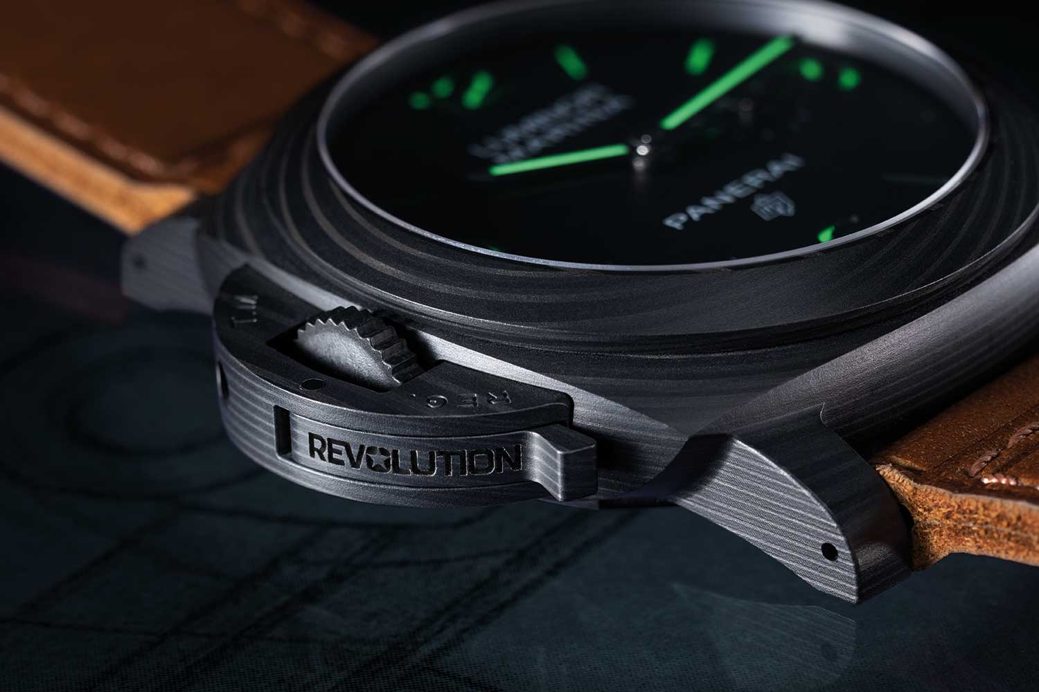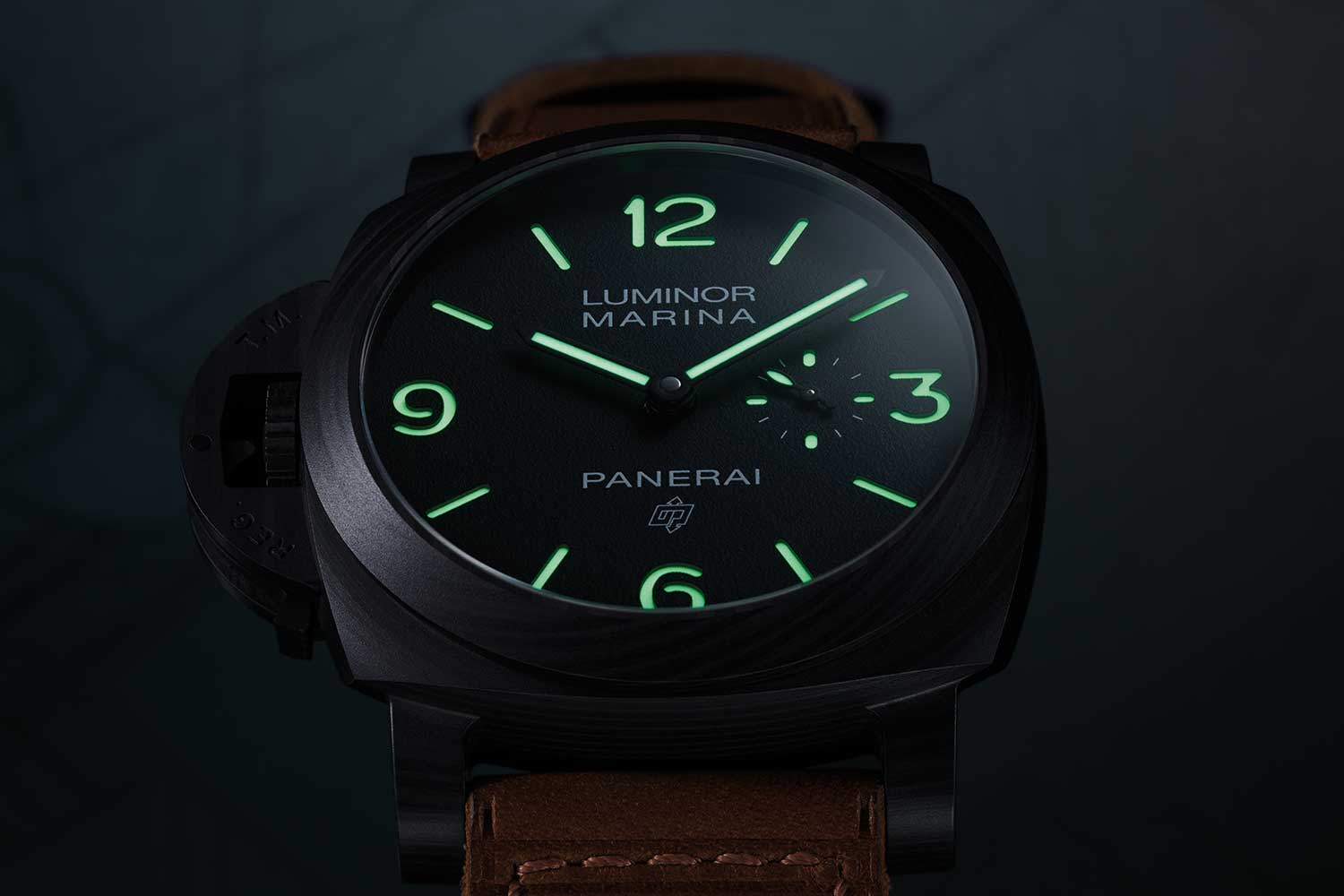 A distinguishing mark of this special Panerai x Revolution 20th Anniversary Luminor Marina Destro Carbotech PAM01708 (©Revolution)