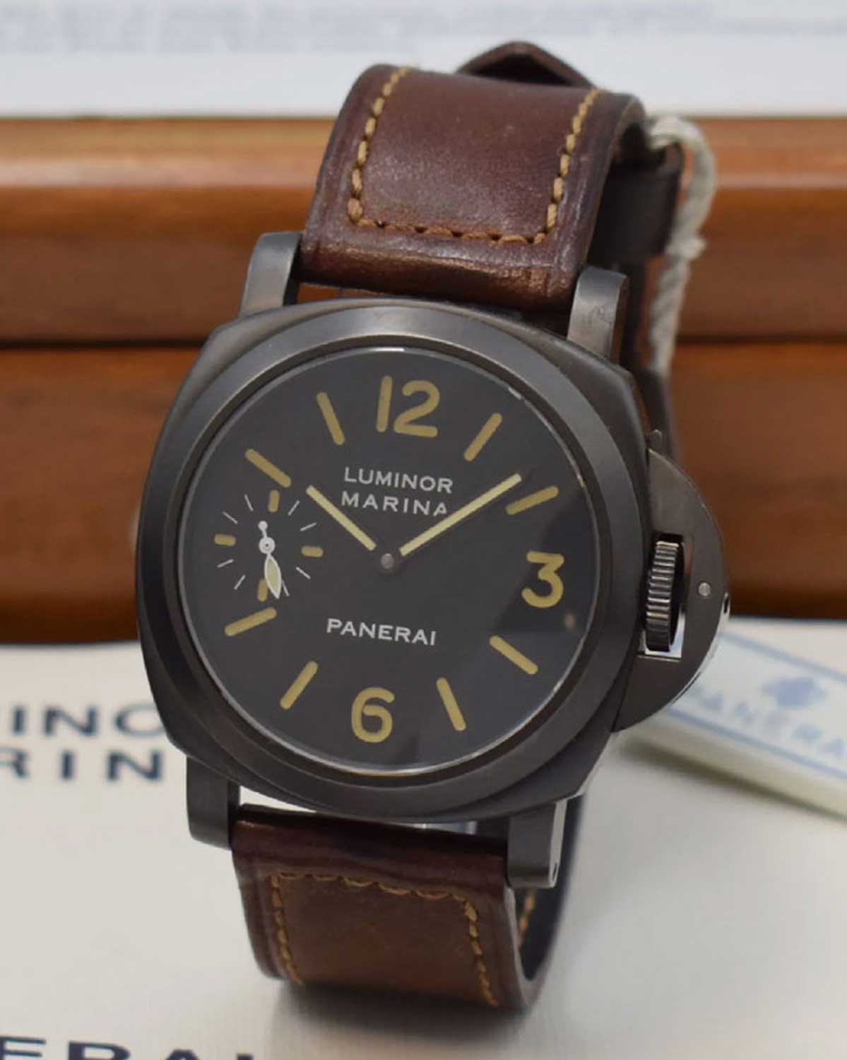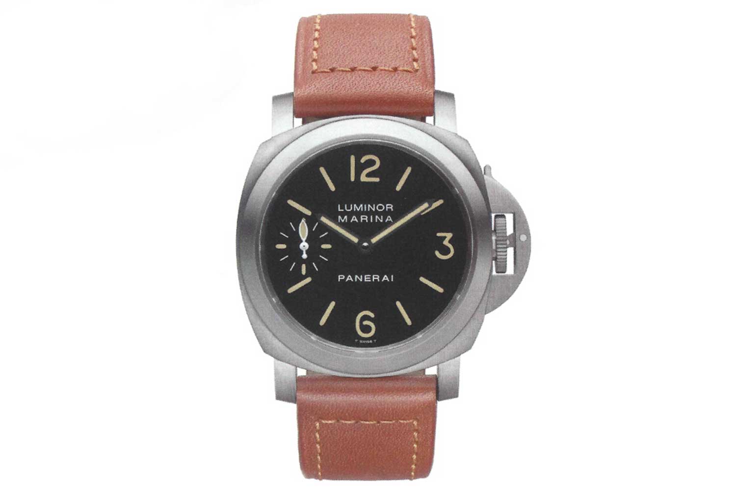The distinct PAM00036 watch with titanium case and tobacco-brown dial appeared in the 1998 catalog in all its transcendent glory. Yet somehow, the watches weren’t released until 1999, which explains why they were engraved with a “B” serial number, corresponding with that year. A popular theory is that Bonati intended the PAM00036 as part of the first salvo of watches. Giving credence to this is the fact that the luminous indexes of the PAM00036 are tritium. Tritium was used for all “A” series dials; however, because of changes in Swiss law, by the “B” series the following year, all Panerai dials (with the exception of its professional certified diving watches and special edition PAM00040) would feature Luminova indexes. This would lead us to believe that the dial of the PAM00036 could have been manufactured in 1998, along with all other A-series tritium dials.