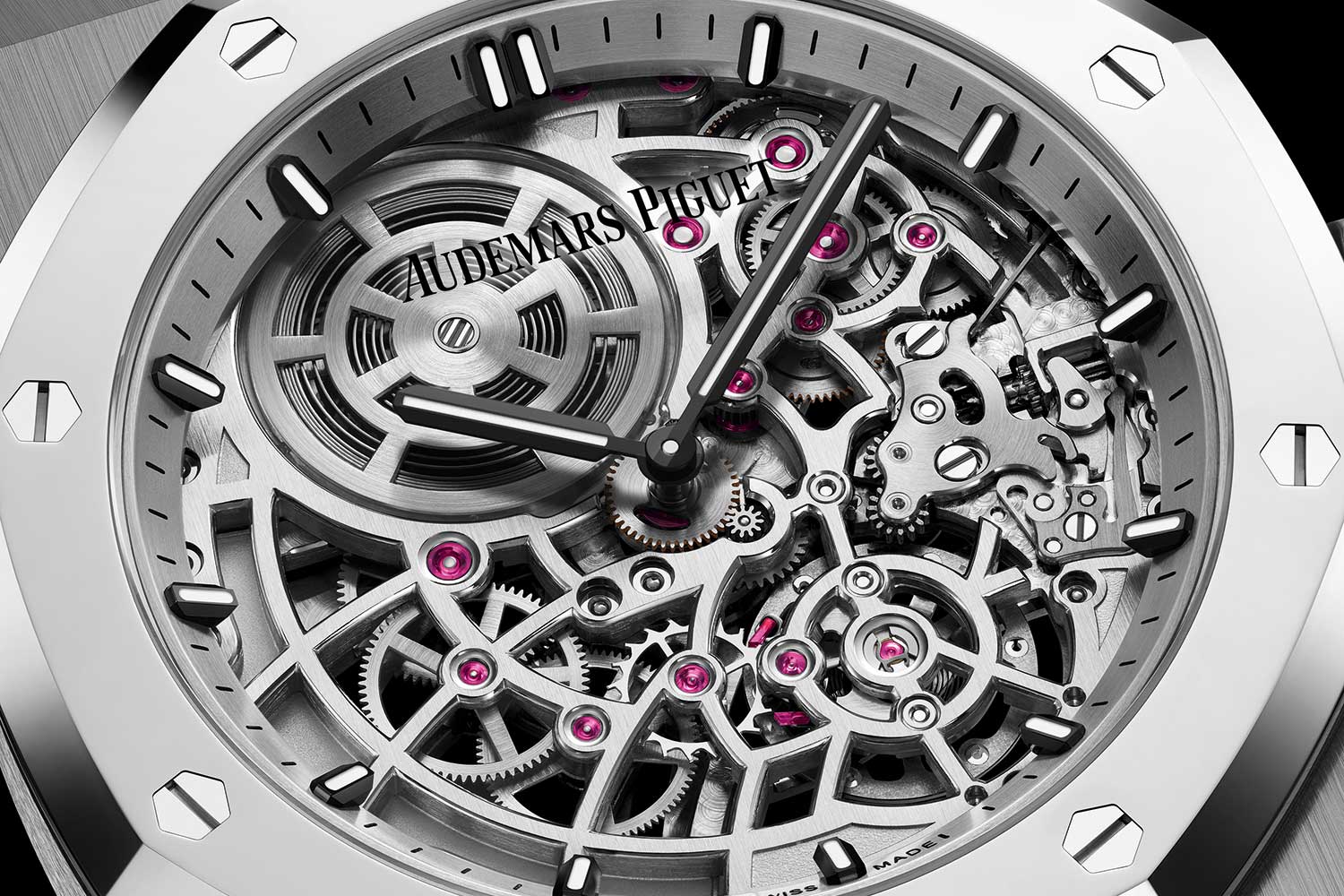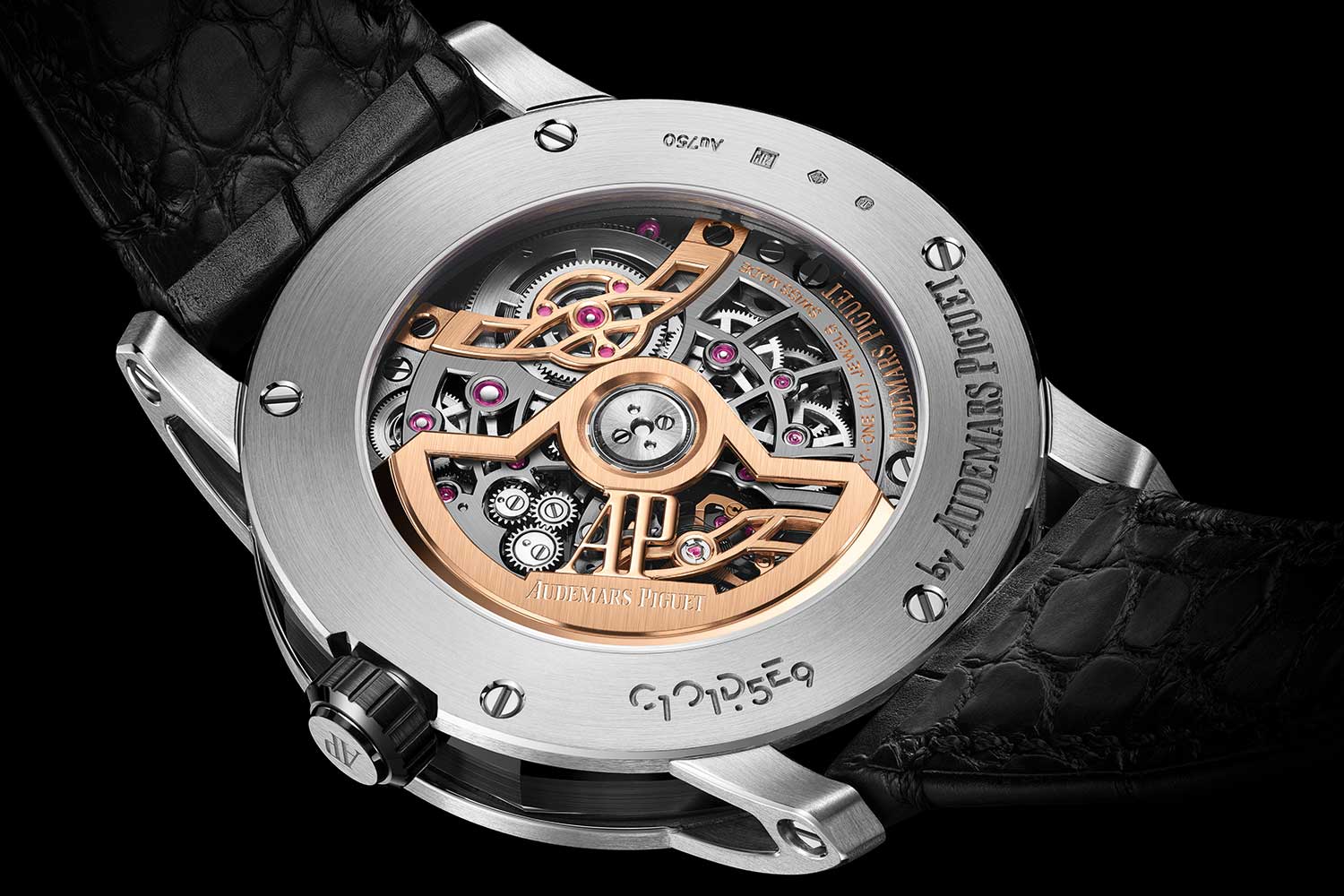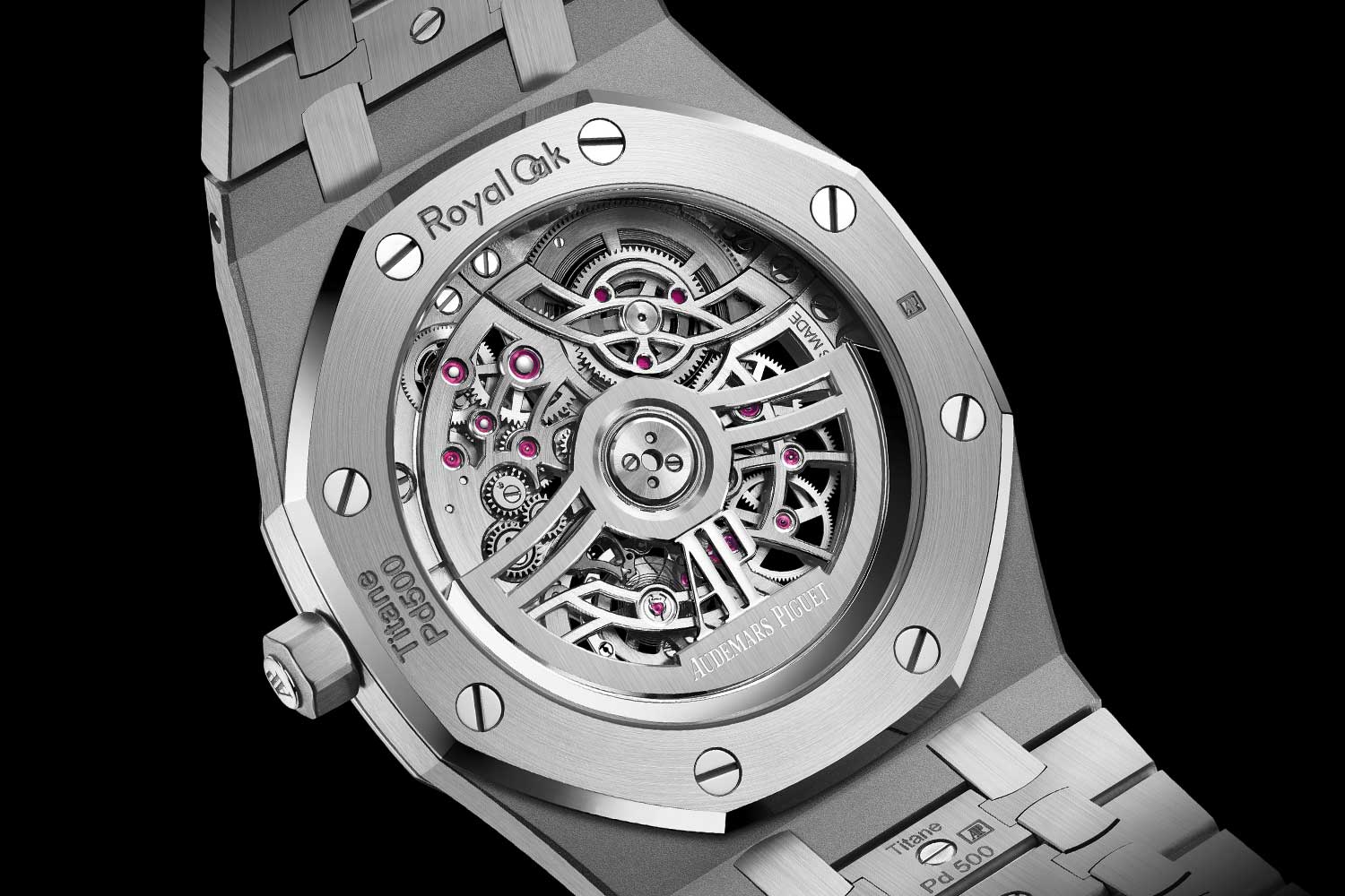 First discovered in the 1960s, BMGs are metallic alloys that, when rapidly cooled, take on properties similar to glass, such as high strength and an amorphous structure. Composed of over 50% palladium, Audemars Piguet’s proprietary BMG is ultra-resistant to the vagaries of daily use – the bezel, caseback and bracelet studs are crafted from this precious material and mirror polished that contrast with Royal Oak’s case, crown and bracelet in titanium – highlighting the model’s complex architecture as well as its incredibly complicated heart.