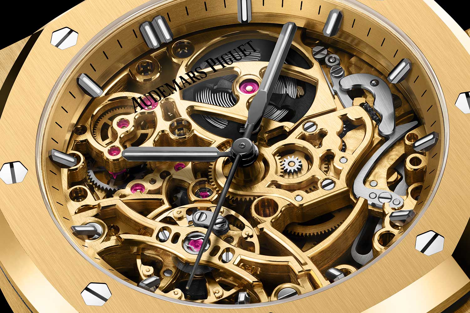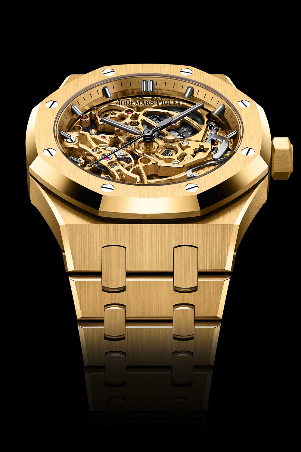 Dial Yellow gold-toned open-worked dial, silver-grey toned rectangle 18-carat pink gold hour-markers and 18-carat white gold Royal Oak hands with luminescent material, yellow gold-toned inner bezel