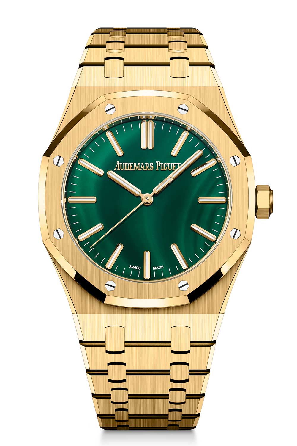Two Royal Oak Self-winding models in 18-carat yellow gold, sized at 37 mm and 41 mm, arrive with polished malachite dials with its highly organic patterning formed during crystallisation, with hue variations shaped by copper content, meaning no two dials can ever be replicated. In a world of industrially perfect gradients, malachite offers a humble one-of-a-kind nod to rarity.