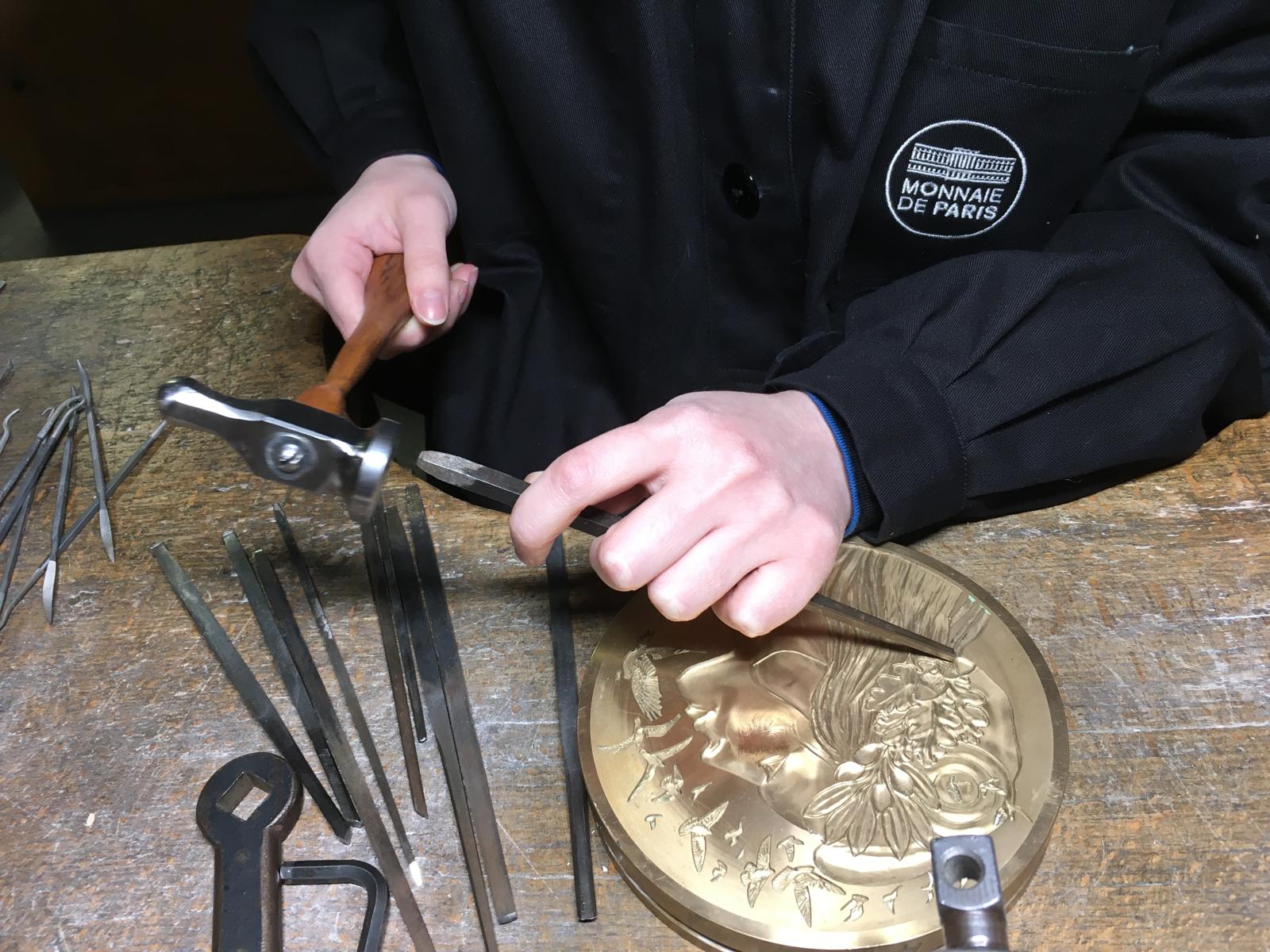 An artisan at Monnaie de Paris hand-finishing a die — the same centuries-old coin-striking craft adapted to create the sculpted dials of Beaubleu’s La Pièce