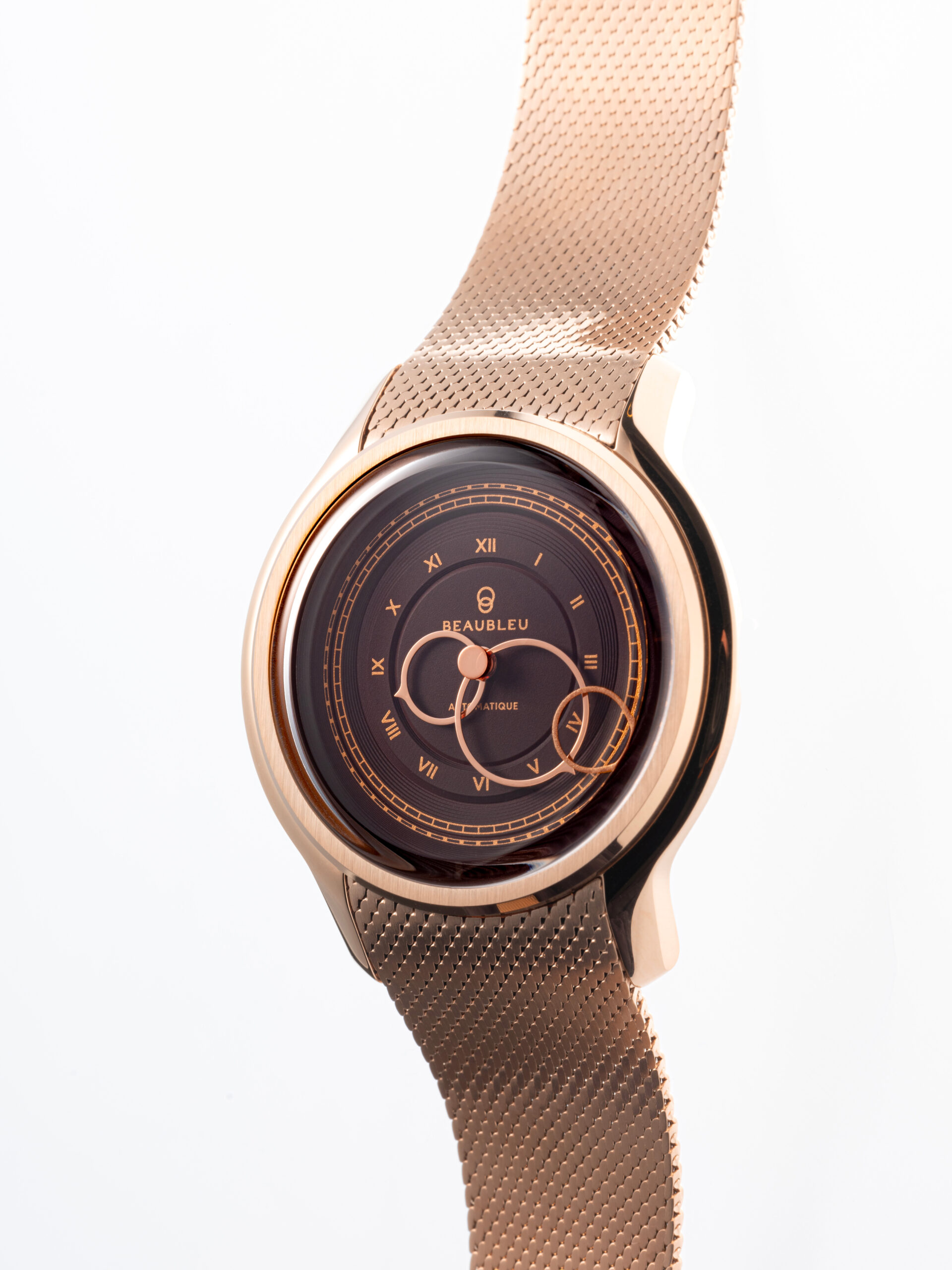 - Beaubleu La Pièce N°2 (Or Rose) — warm tones accentuate the depth of the one-piece dial, where indices and surfaces are machined directly into the metal