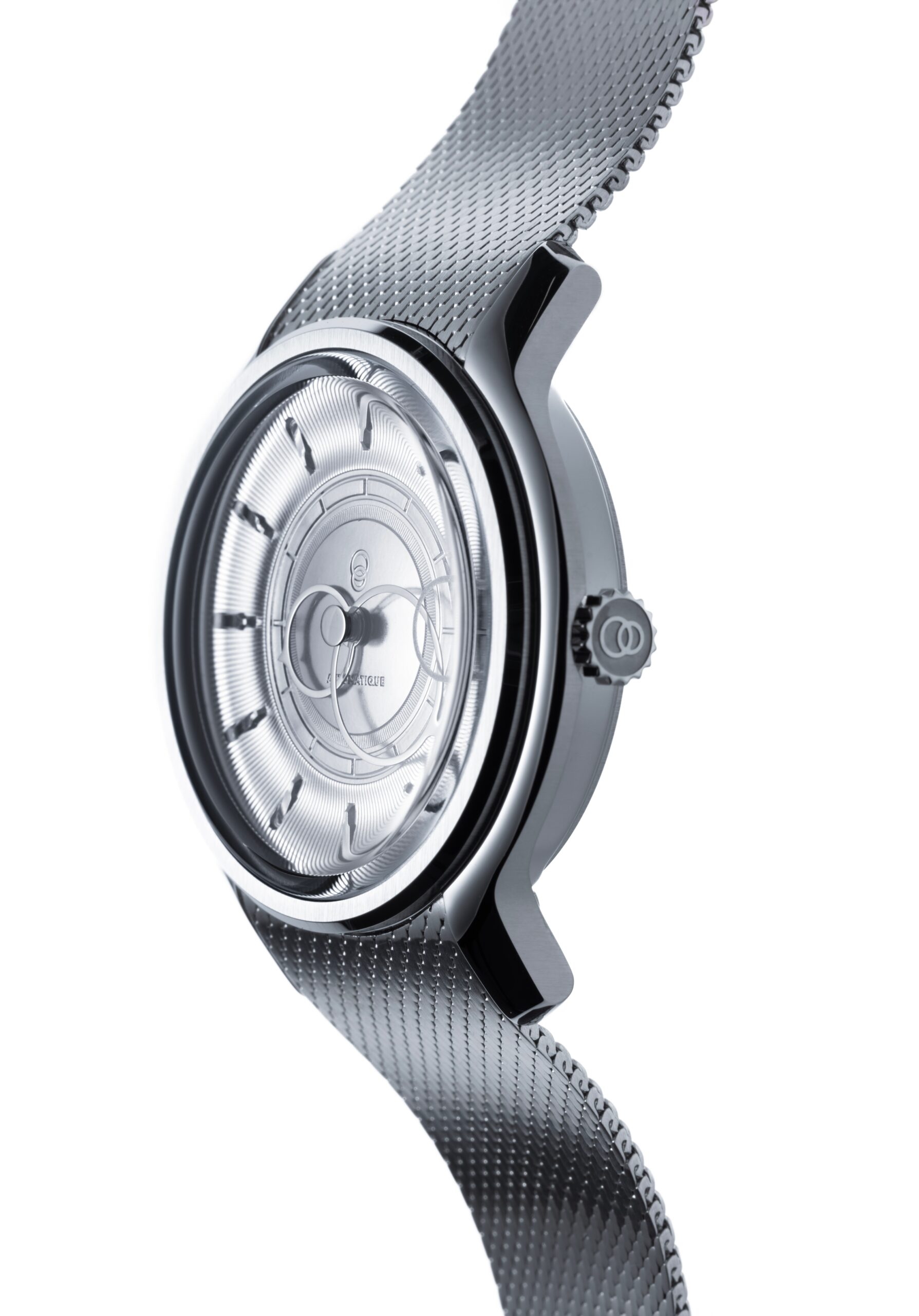 La Pièce N°2 pushes the technical achievement further. Here, the interior surfaces of the dial including the hour markers themselves have been machined directly from the struck metal, and mirror-polished to create visual depth on the one surface. Mirror-polished alongside satin-finished and iridescent areas allow light to land and play in different ways. In Silver, Rose Gold and Jet Black, the effect is striking.
