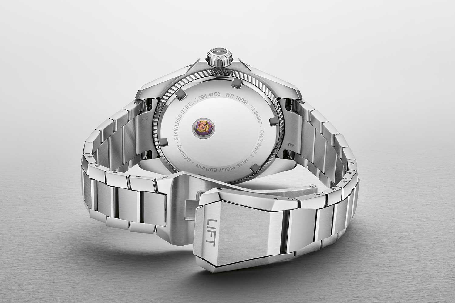 Where the Kermit edition featured the joyful face of Kermit the frog as a little easter egg of sorts, showing up on the date wheel on the first day of the month, Missy Piggy’s visage appears elsewhere. In this case, on the automatic rotor, which is finished in a soft lilac color. Through a small hole in the caseback, perfectly aligned, is Miss Piggy’s likeness.