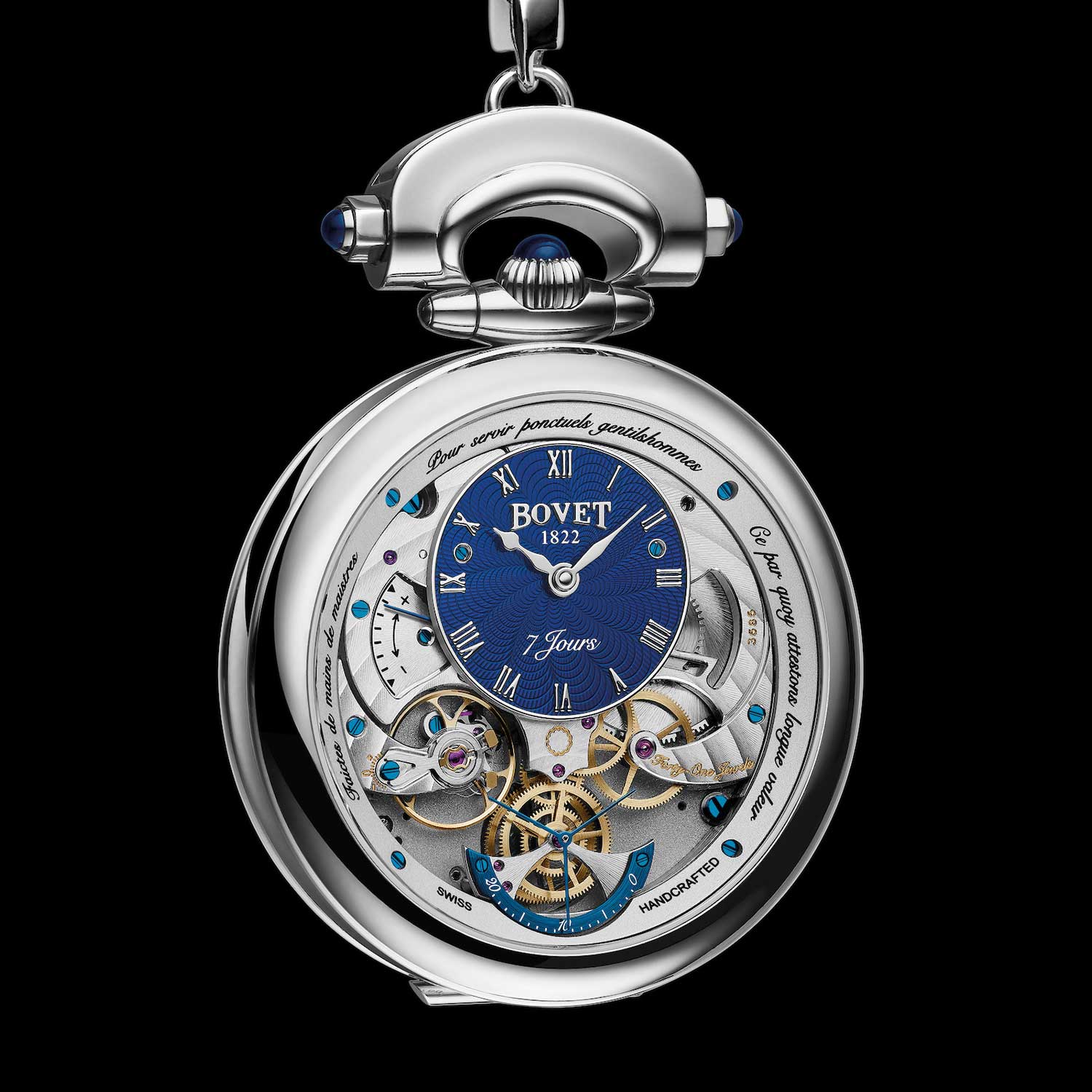The first two showcase Bovet’s patented Amadeo system; both timepieces can be easily transformed into wristwatch, pocket or pendant watch and table clock with a few swift taps. Both also bear exquisite dials showcasing Bovet’s expertise in métiers d’art. Monsieur Bovet, in addition, features a signature dual-sided display including the patented double coaxial seconds display, where the seconds can be read on both side of the movement, moving in opposite directions while sharing the same axis.