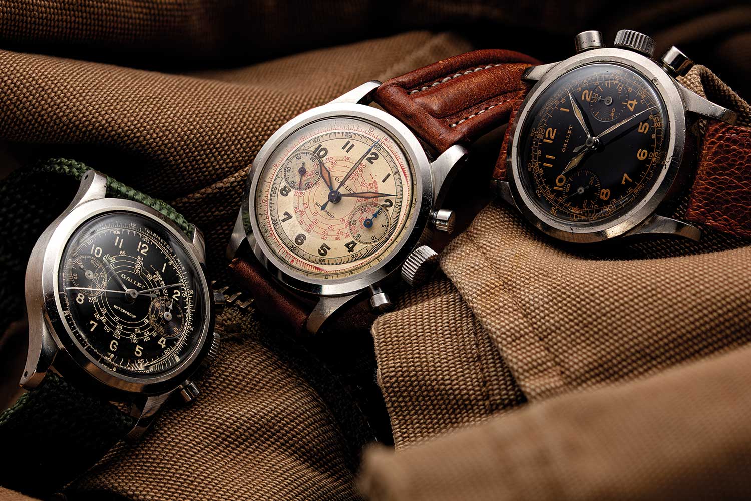 A trio of Gallet Multichron Clamshell watches from around 1938; the world’s first water-resistant wrist chronograph