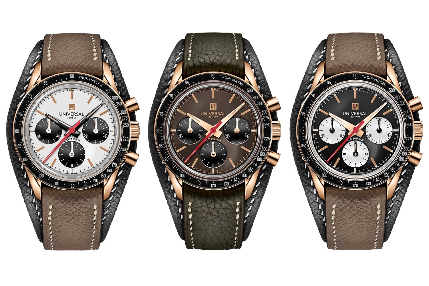 Universal Genève restored archival Caliber 281 movements from the Compax’s era: manual-winding, column-wheel chronographs of 28.5 mm diameter and 7.10 mm thickness. The watches feature Grand Feu enamel dials with chronograph counters.