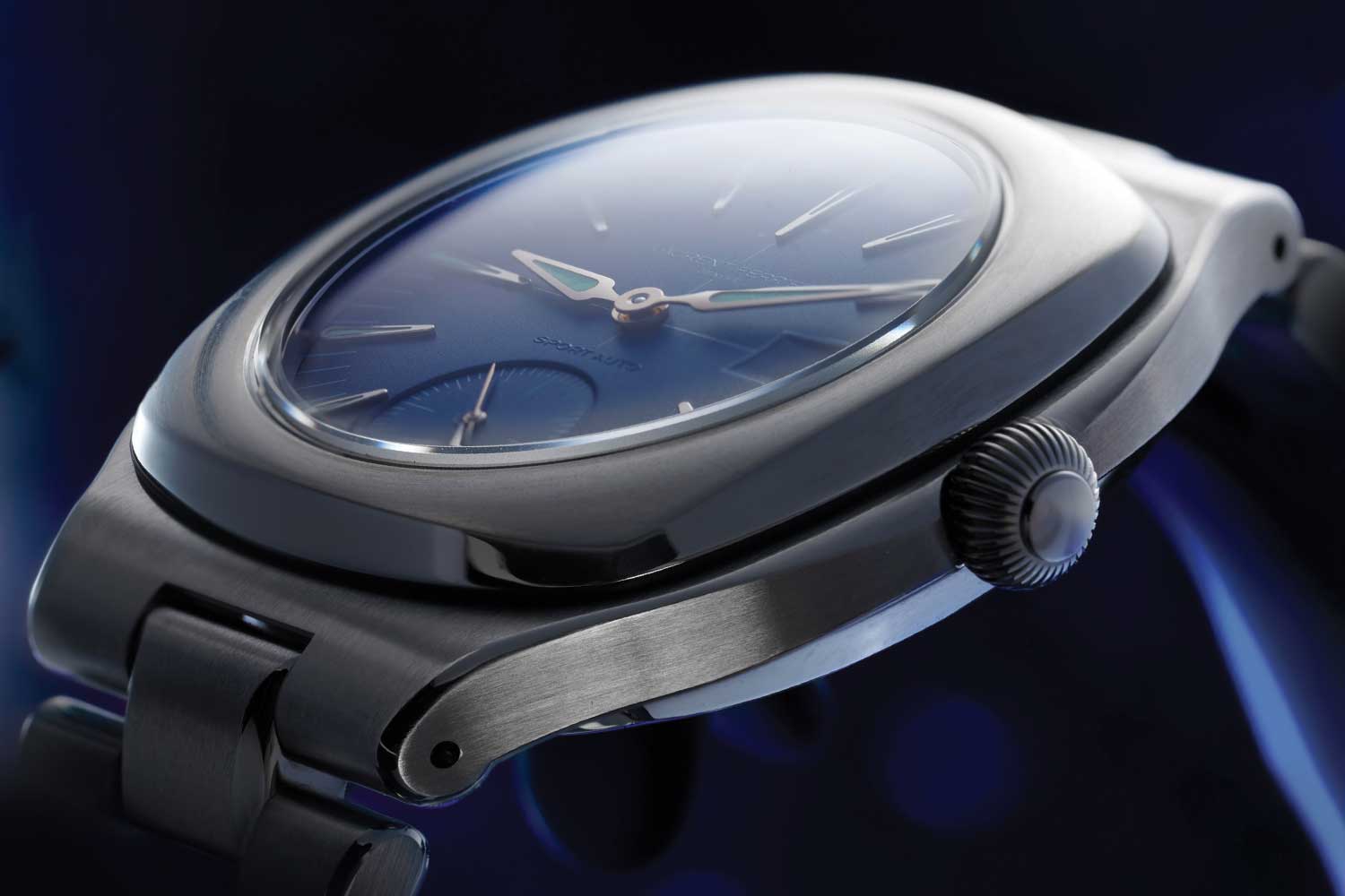 Much of that distinction stems from its design language, a subtle but original approach that charts a new course for integrated-bracelet sports watches. The case is soft and supple rather than angular, giving it a distinct presence on the wrist. Despite being around 12 mm thick, which is thicker than most high-end integrated-bracelet sports watches, it feels surprisingly balanced and comfortable, demonstrating that an integrated-bracelet sports watch can succeed without following the conventional thin and angular formula. This is possible because the watch is made entirely of lightweight titanium instead of the more typical steel, allowing it to have visual presence without feeling uncomfortable.